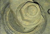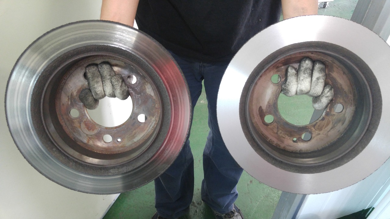 디스크도 오래되어 단차가 꽤 많이 생겼으며, 이 때문에 패드 또한 단차가 생겼다. 좌측은 오일이 누유되지 않고 쇳가루만 보이는 상태.