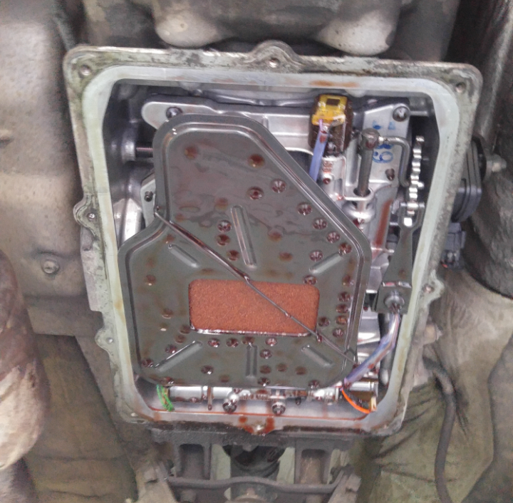 미션오일 필터 탈거 후. 각종 일레트로닉 키트를 포함한 밸브바디가 보인다. 미션오일 필터, 개스킷과 함께 미션오일 교환 완료 후 꼼꼼히 세척해 주셨다.