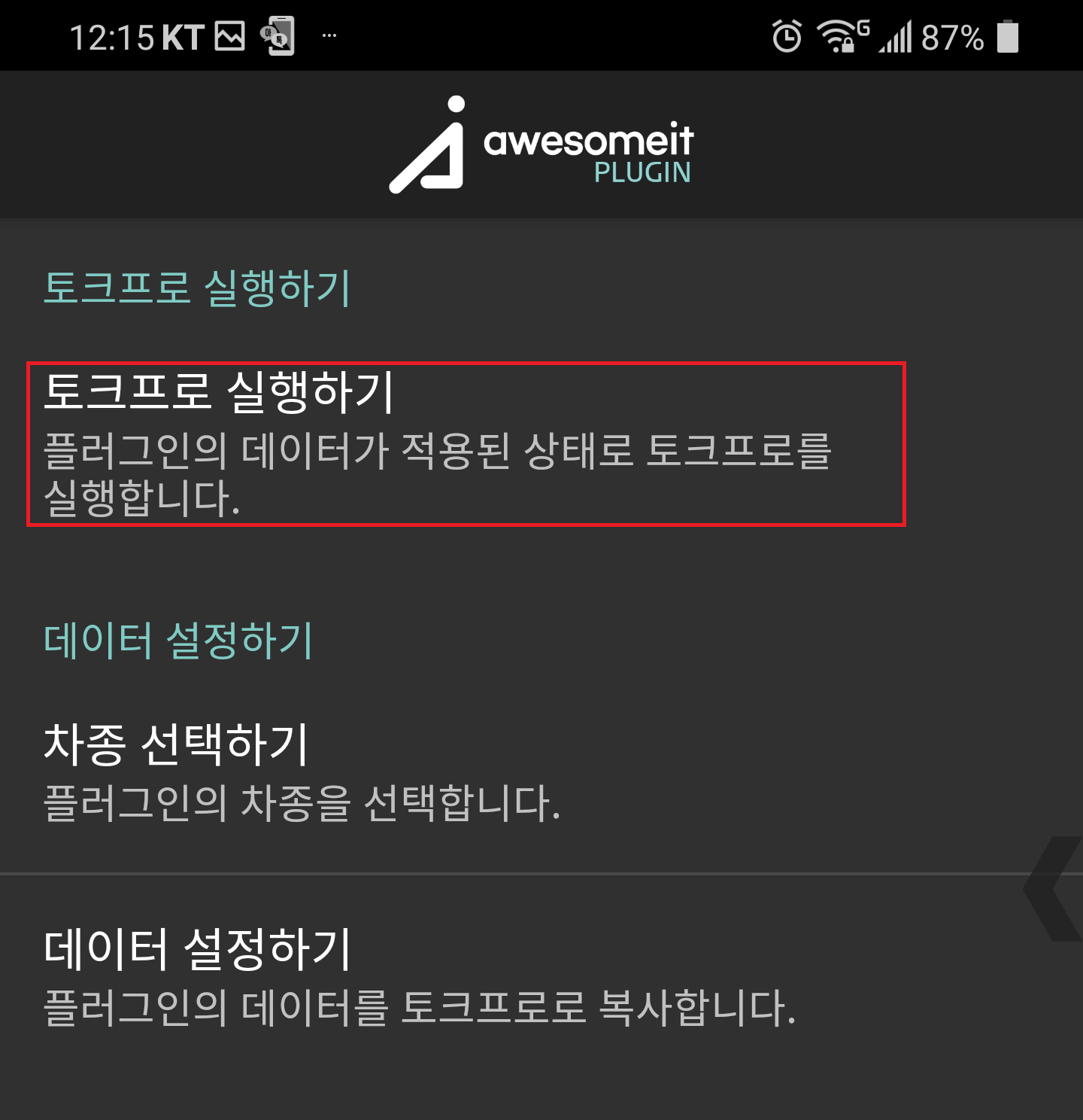 12. "Awesomeit Torque Plugin" 메뉴를 터치한 후 뒤로가기 버튼을 터치하여 앱의 메인화면으로 이동한다.