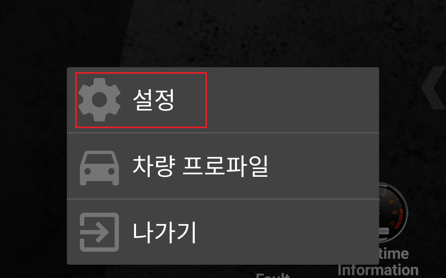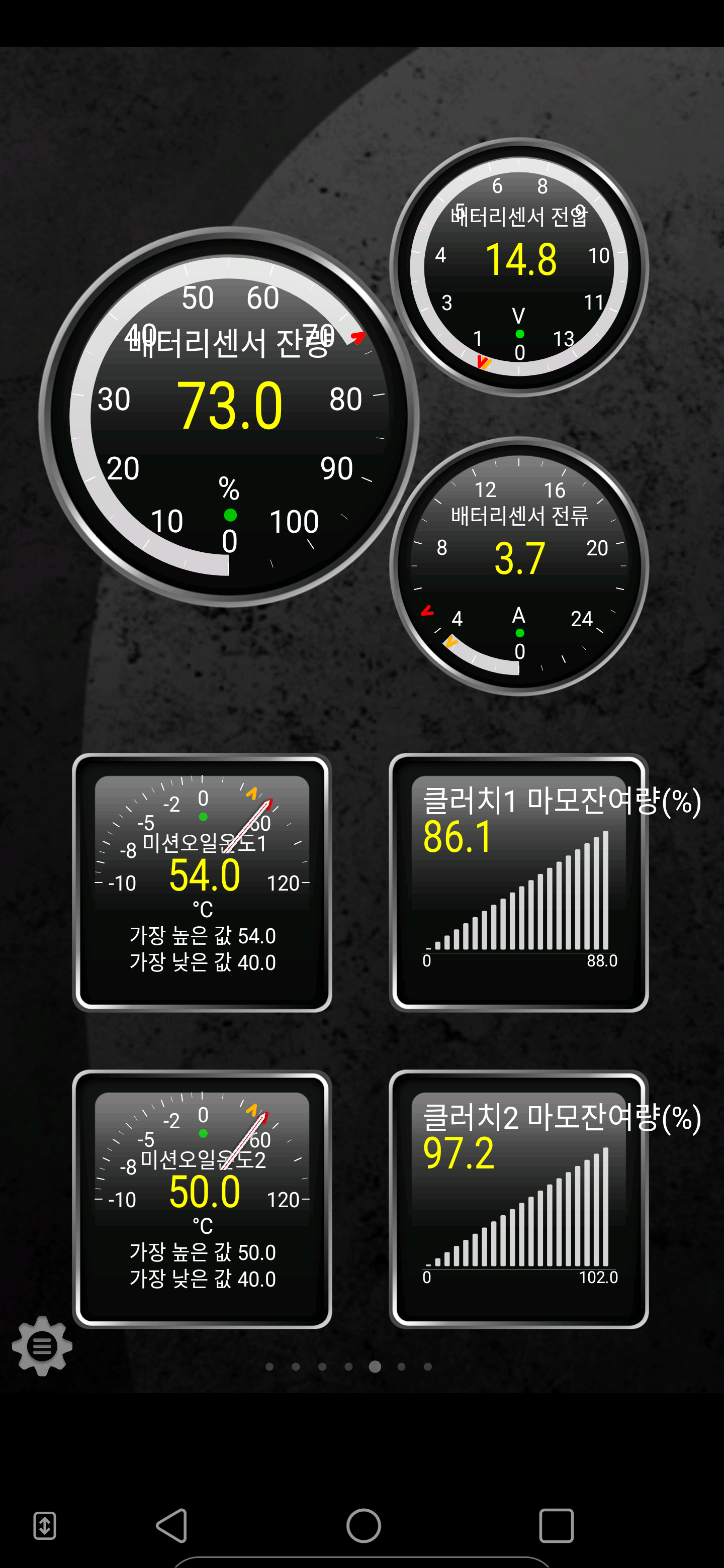 7. Torque Pro 앱의 추기화면에서 좌측 하단의 기어 모양의 설정 버튼을 터치한다.