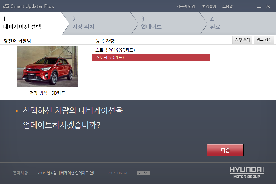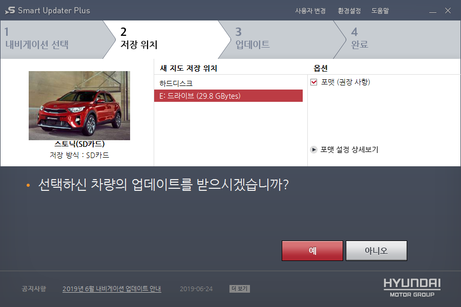 SD 카드를 삽입한 후 스마트 업데이터 플러스를 실행하면 SD카드의 정보를 읽어 차량에 맞는 내비게이션이 자동으로 선택된 후에 "저장 위치" 화면이 표시된다.