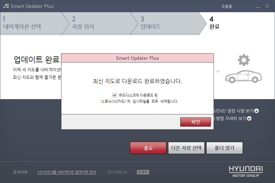 "확인"을 눌러 대화상자를 닫는다. 좌우 버튼을 클릭하면 차량 내비게이션에서 업데이트를 적용하는 순서가 나오는데, 전체 내용은 아래에 다시 정리했다.