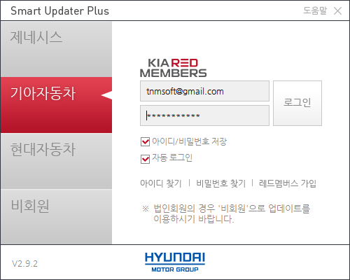 만일 프로그램 SD 카드를 PC에 삽입하지 않고 프로그램을 실행하는 경우 로그인 하거나 비회원으로 진행할 수 있다. 로그인을 하고나면 레드멤버스에 등록한 차량이 표시되고, 비회원으로 진행하는 경우 차량을 내비게이션 선택 화면에서 직접 선택해야 한다.