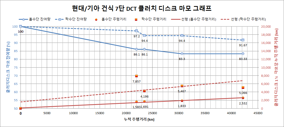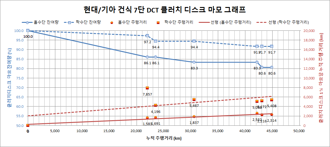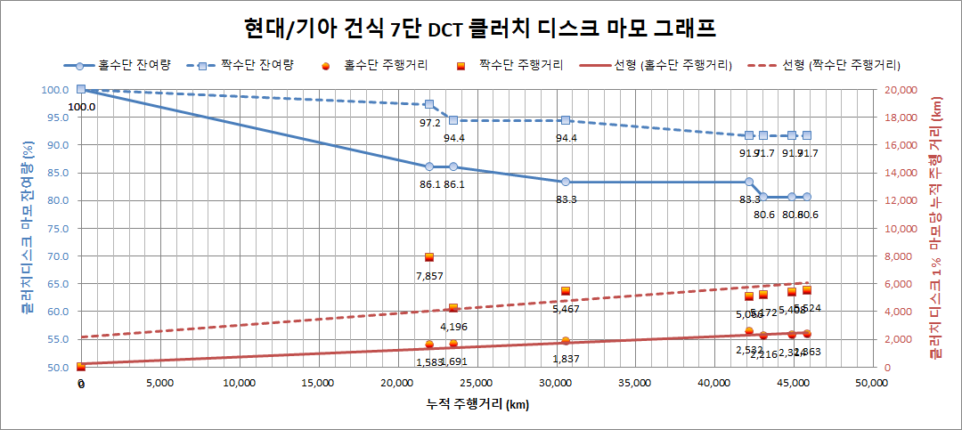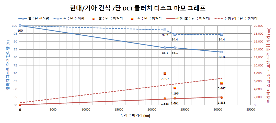 - 짝수클러치: 97.2 % (1 % 당 7,857 km 주행, 50 % 도달 시 392,857 km 주행 예상)