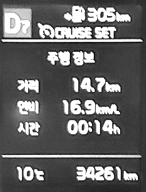 이 시점에서의 주행거리, 연비 및 주행시간을 확인해 둔 후 트립 연비를 초기화 한다.