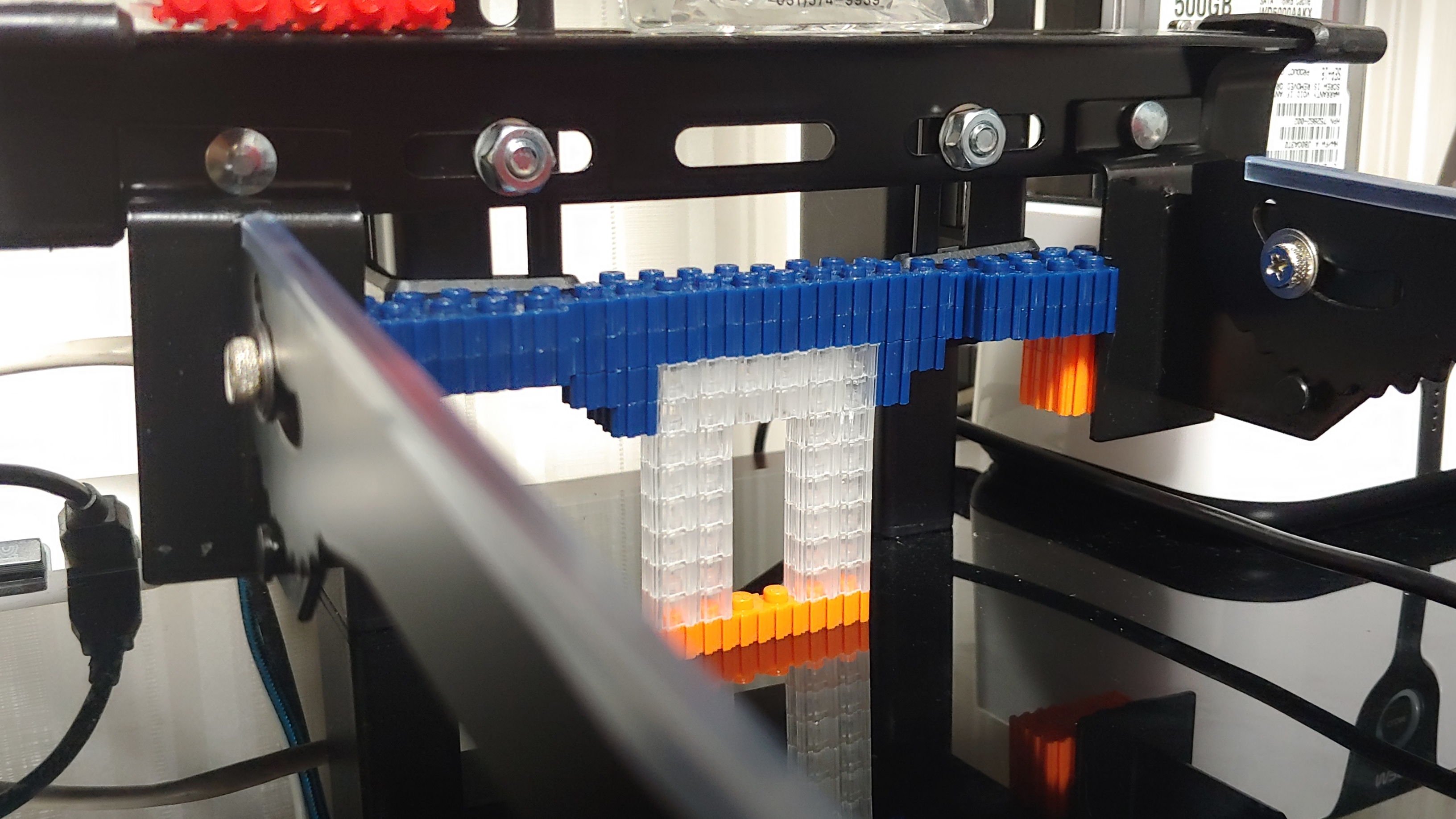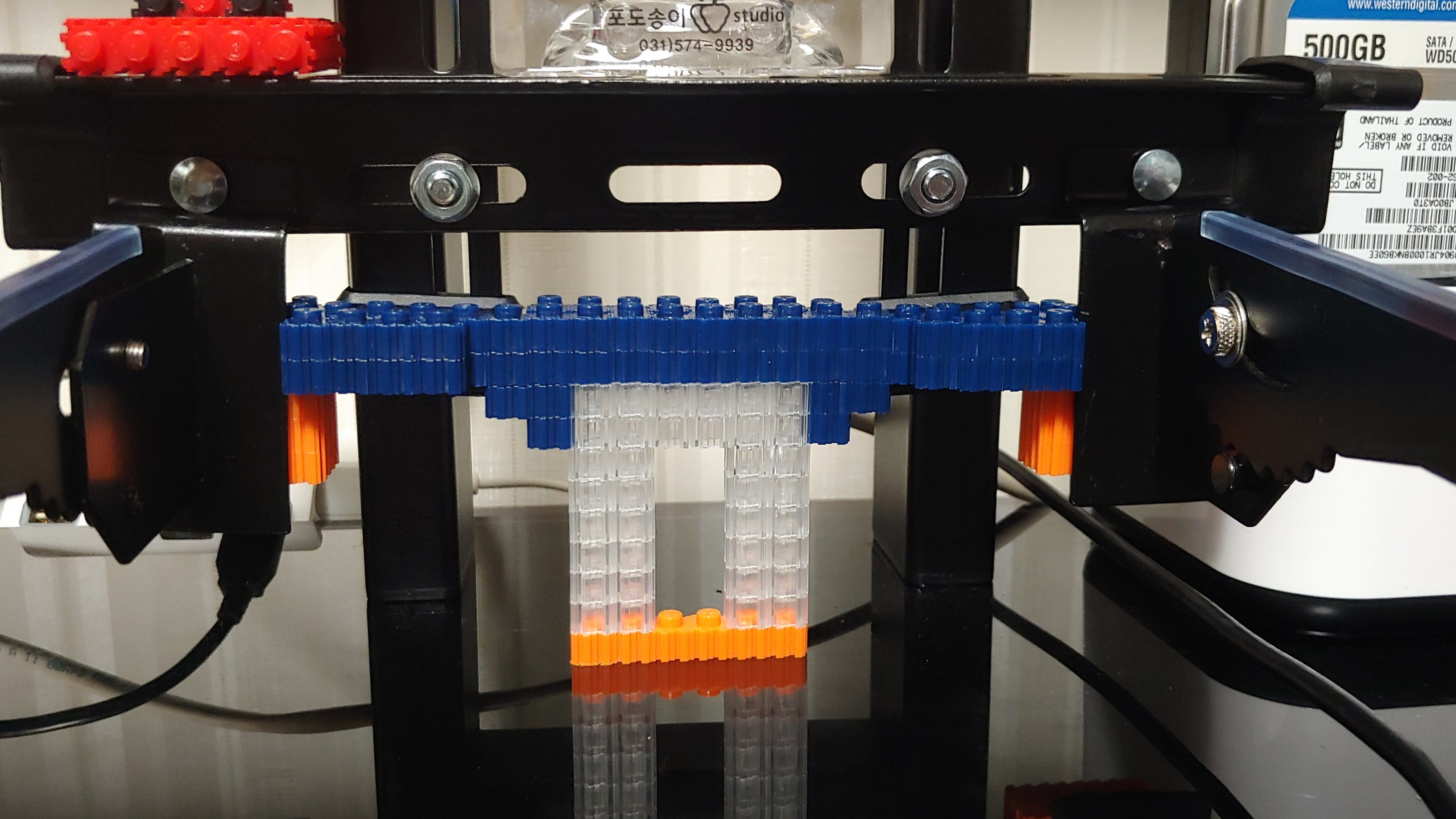 계속 사용하다 보니 좌우측 선반 날개의 휘어짐 정도가 달라 노트북이 기울어지는 것이 눈에 띌 정도로 보이기 시작했다. 선반 날개가 상단의 볼트만으로 결합되어 브라켓 하단이 떠 있기 때문에 발생한 현상인데, 알맞은 길이와 두께의 목재로 받쳐주는 것이 좋겠다고 생각이 든 순간, 아이들이 가지고 노는 디폼블럭이 떠올라서 아래와 같이 조립해 봤다.