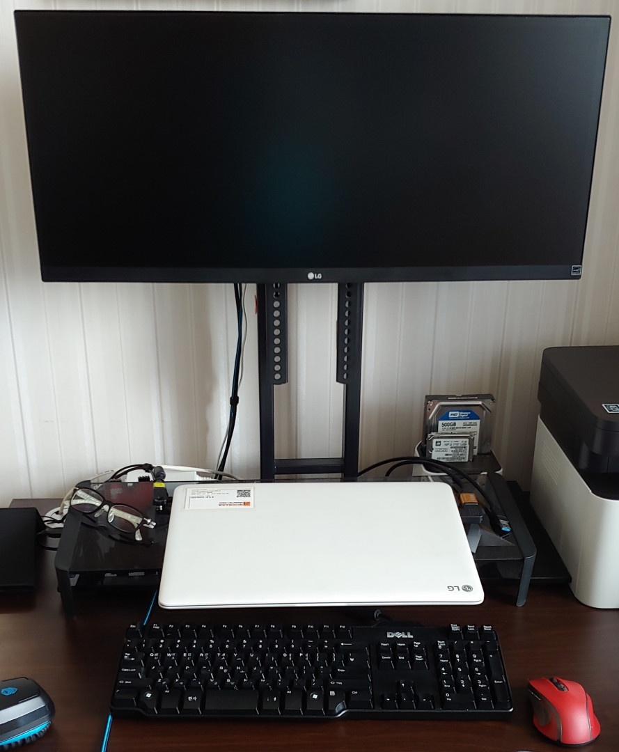 적용이 완료된 상태는 아래 사진과 같다. 사진으로 보면 큰 차이는 느껴지지 않지만, 노트북을 받치고 있던 모니터선반이 사라짐으로 인해 매우 깔끔해 진다.