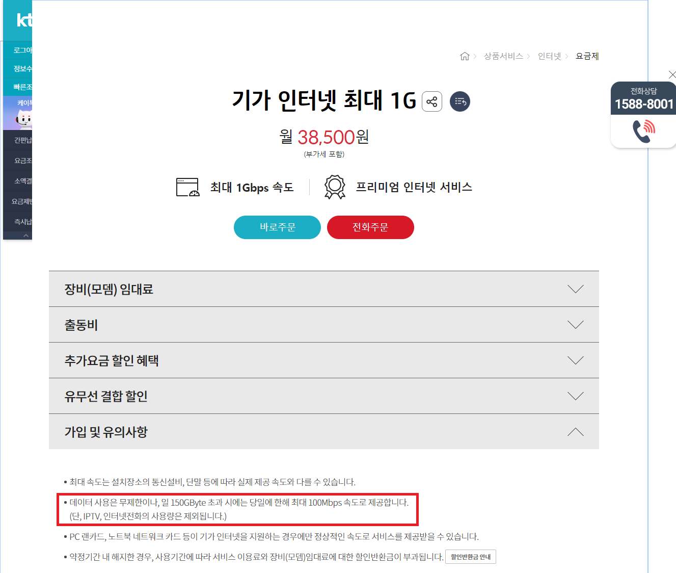 상담원분께 안내 받은 내용으로는 필자가 가입한 기가인터넷 최대 500M 짜리 상품인데, 이 상품은 일 150 Gbyte 초과시 100 Mbps 제한2이 걸린다는 것... 필자는 가입시 안내받았던 내용을 기억해내고는 아차 싶었다.