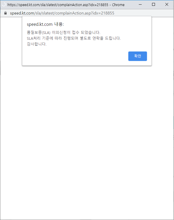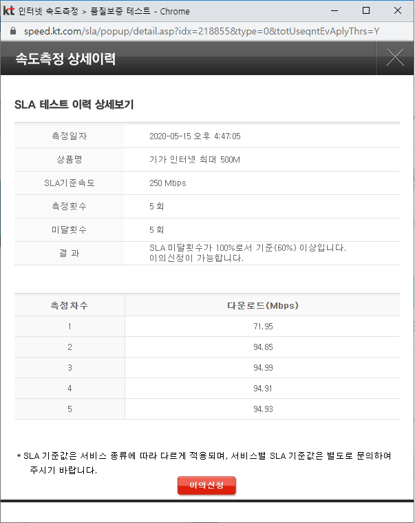 결과를 확인해 보니, 이의 신청이 가능한 상태이다. "이의신청" 버튼을 클릭했더니 아래와 같은 내용이 표시된다. 내용인 즉, 일일 사용총량 초과로 확인되니 내일 다시 측정해 보라는 것. 일일사용총량 제한이 있었나 싶어서 일단 "확인" 버튼을 눌러 접수 완료했고, SLA 이의신청 접수가 완료되었다는 팝업 메시지가 표시되는 것을 확인했다.