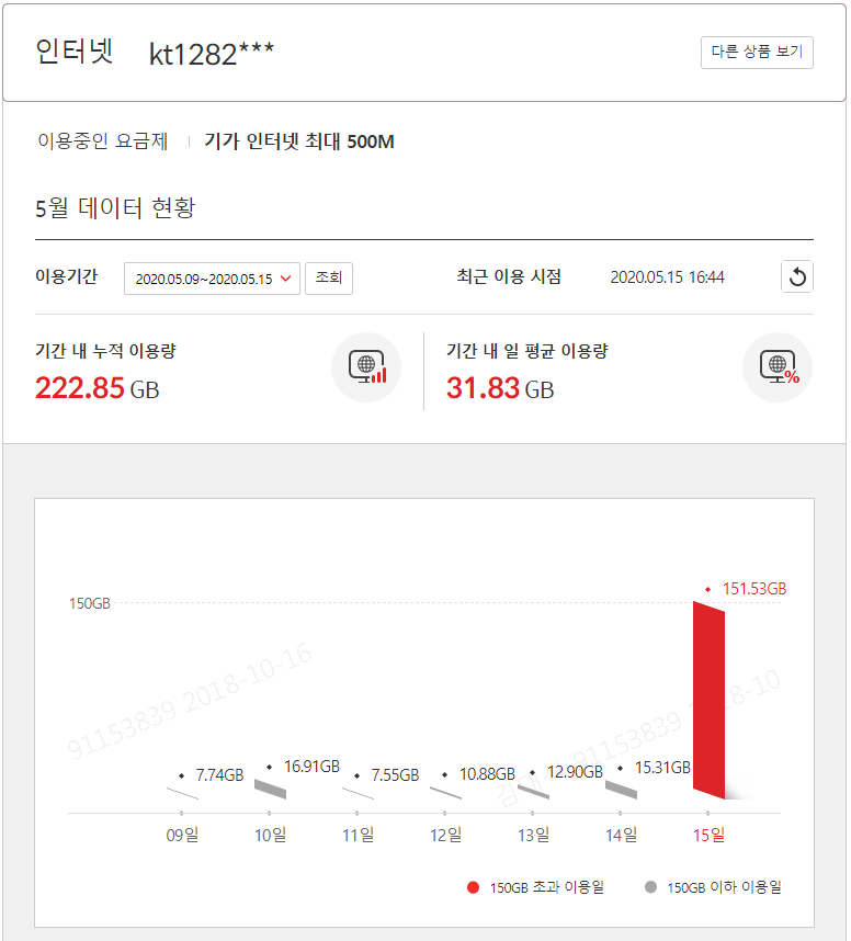 필자의 사용 내역을 보니 오늘 자정 이후부터 150 Gbyte를 이미 초과했다는 것을 확인할 수 있었다.