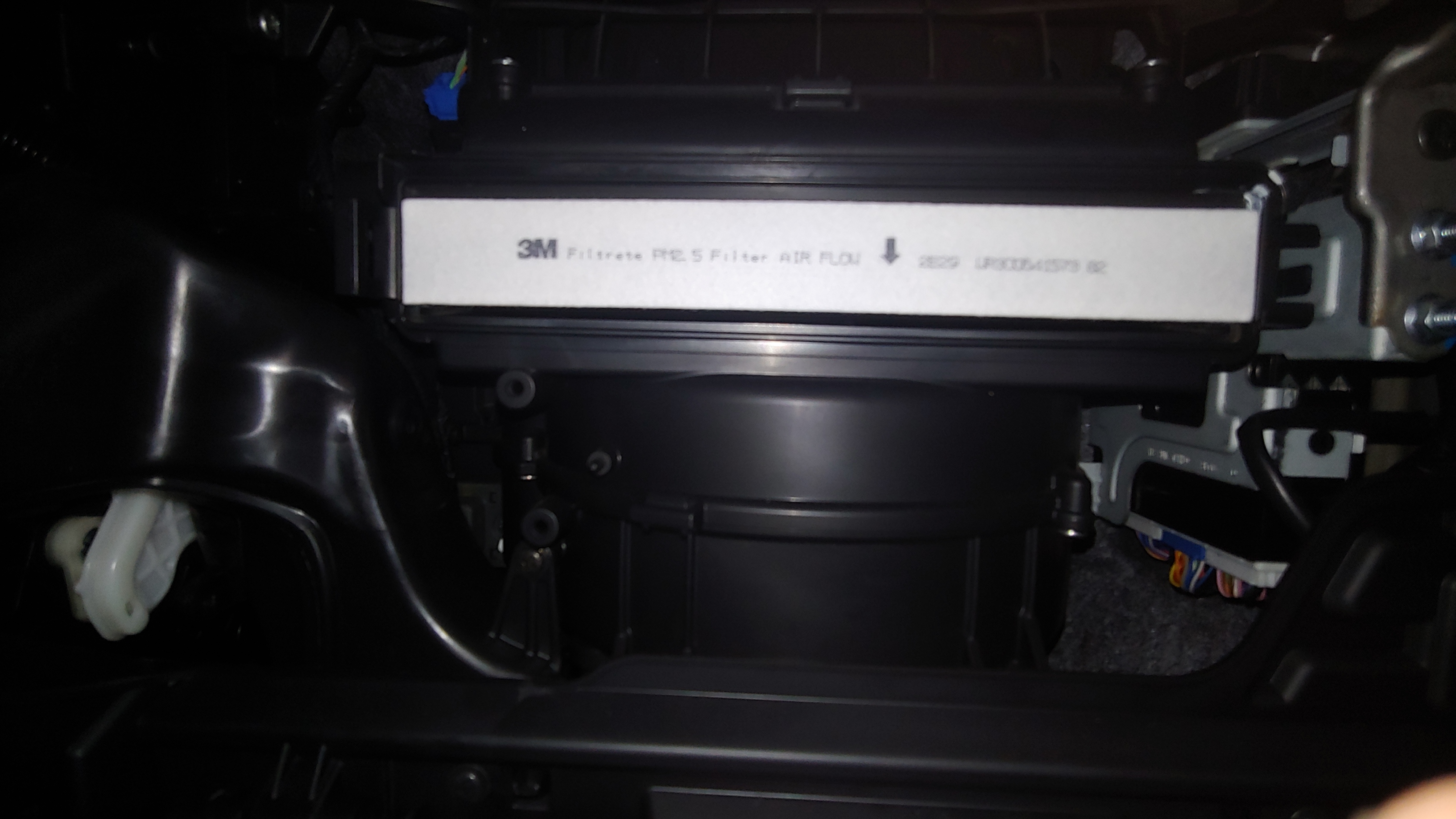 안쪽에 사각형의 공조장치용 에어필터 커버가 보인다. 필터 하단에는 블로워 팬이 위치해 있다. 필터커버의 좌측 잠금핀을 누르고 잡아당기면 커버가 해체된다.