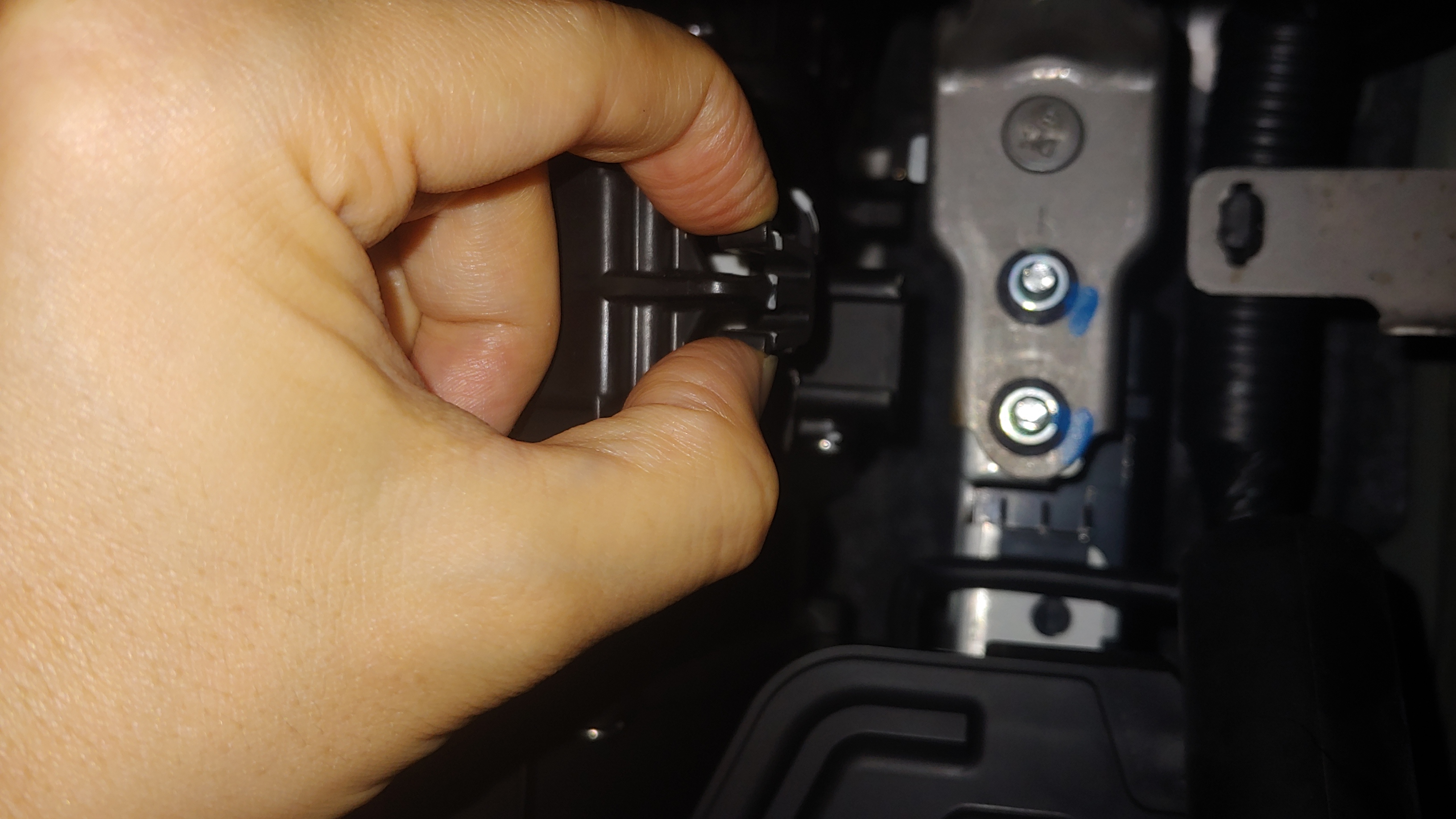 현대자동차 베뉴는 글로브 박스에 노브타입의 스토퍼나 에어 댐퍼가 적용되어 있지 않기 때문에 해당 과정은 생략하고, 고정형 스토퍼가 위치한 글로브 상단에 내측 방향으로 힘을 가한 후 글로브 박스를 탈거하면 된다.