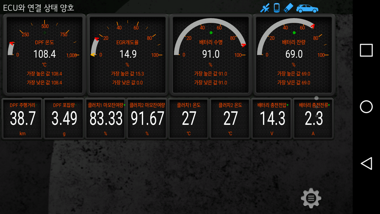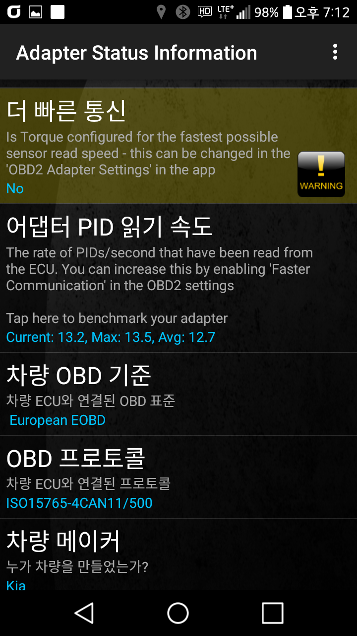 아래 사진은 "더 빠른 통신" 옵션을 선택/해제 한 상태에서의 PID 읽기 속도를 비교한 화면이다. LG Class 단말기 기준 더 빠른 통신 옵션을 켠 경우 평균 21 이상, 끈 경우 약 12 이상의 속도로 동작한다.