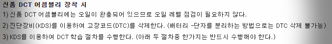 신품 DCT 어셈블리 장착 후 수행해야 하는 절차는 다음과 같다.