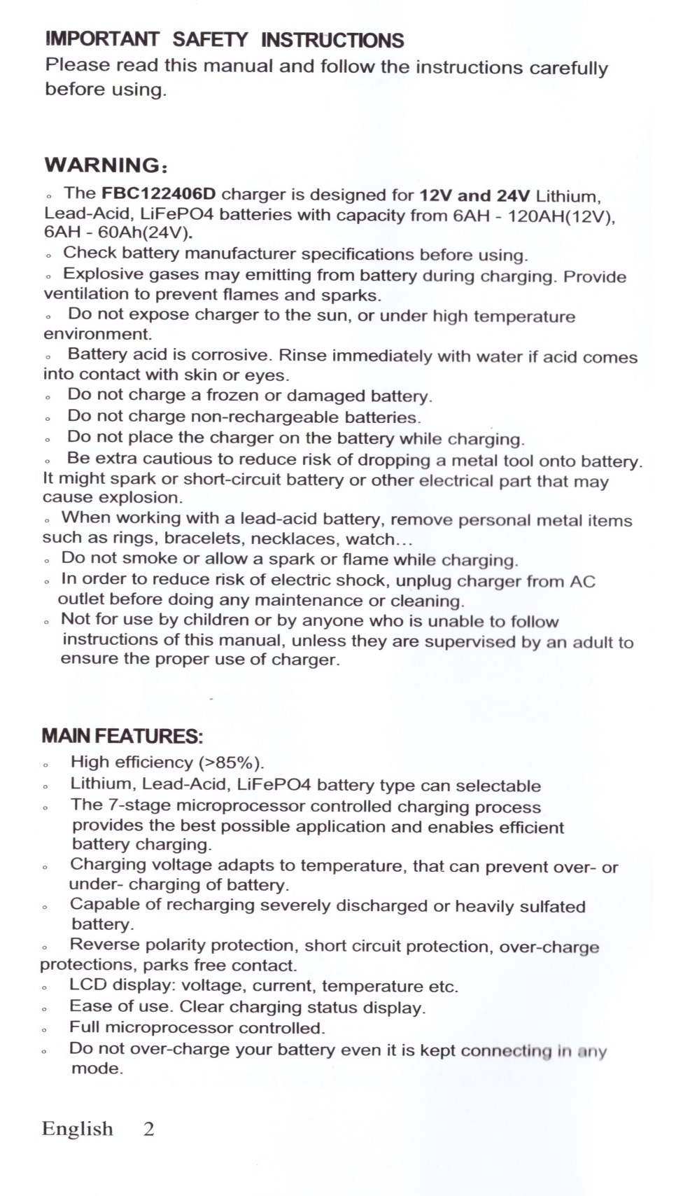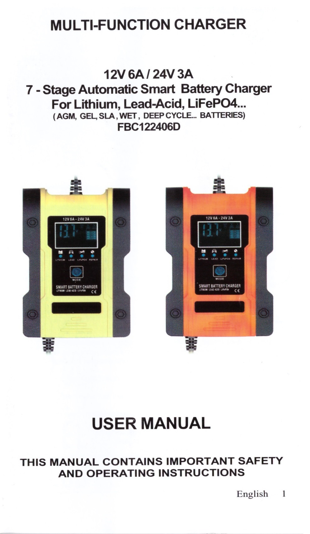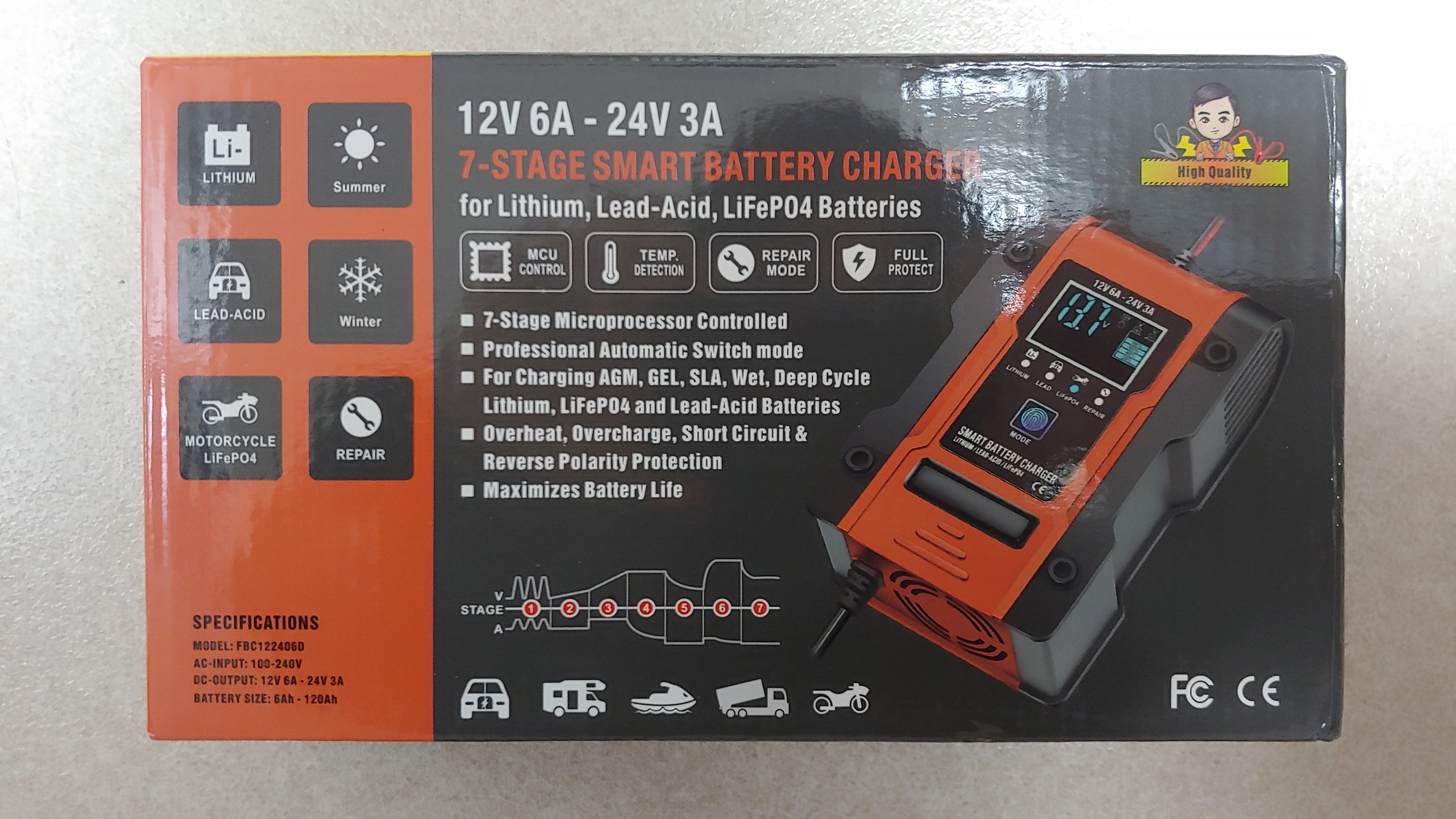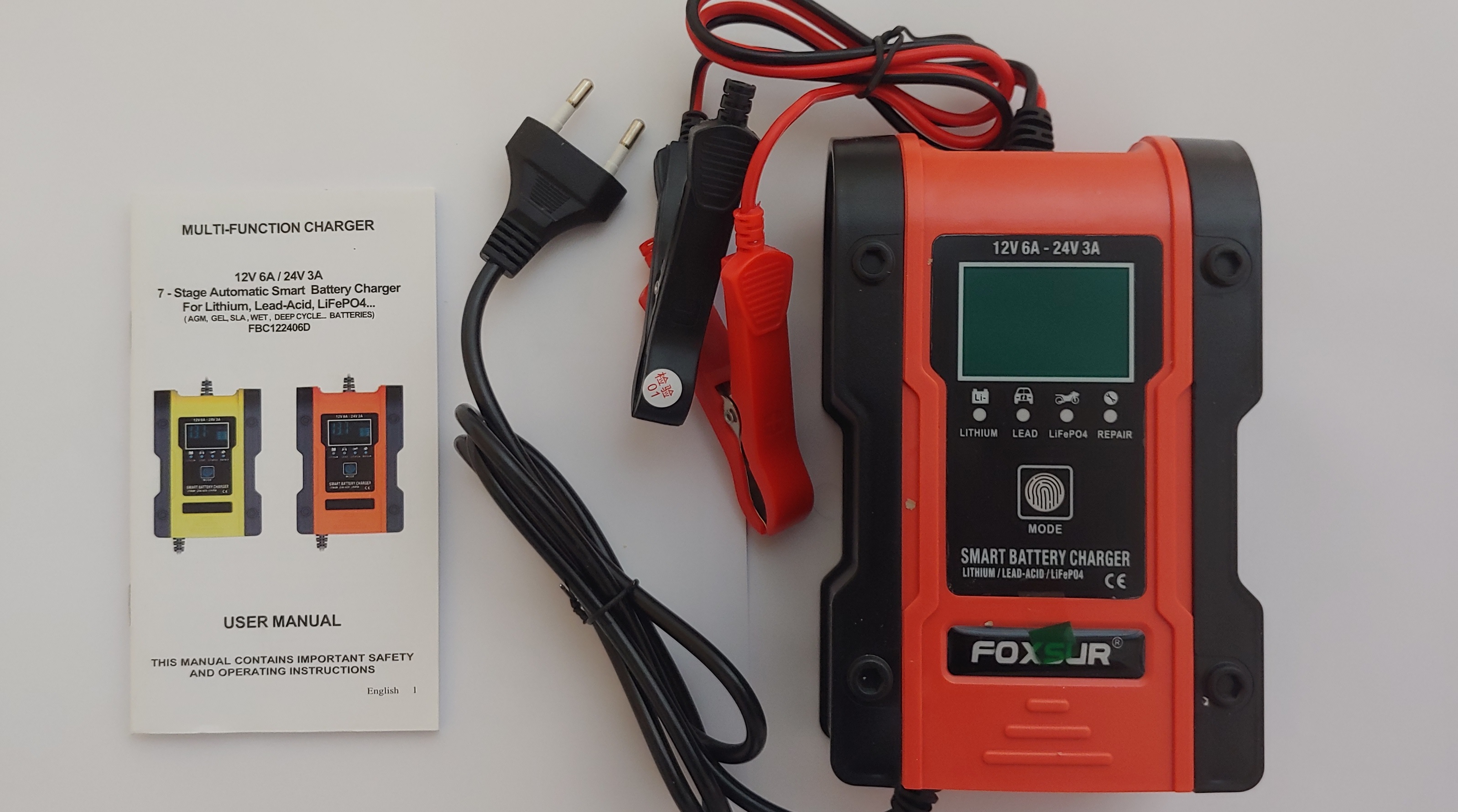 배터리 충전기는 FOXSUR 12V 6A - 24V 3A 7-Stage Smart Battery Charger 를 구매했다. 리튬, 납축전지 및 인산철 배터리 충전 모드와 펄스 복구 모드를 지원한다. 패키지에는 충전기 본체와 사용자 매뉴얼이 포함된다.