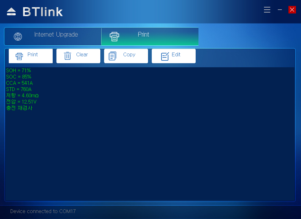 아래 이미지들은 배터리 테스트 결과를 인쇄하기 위한 화면을 보여주고 있다.