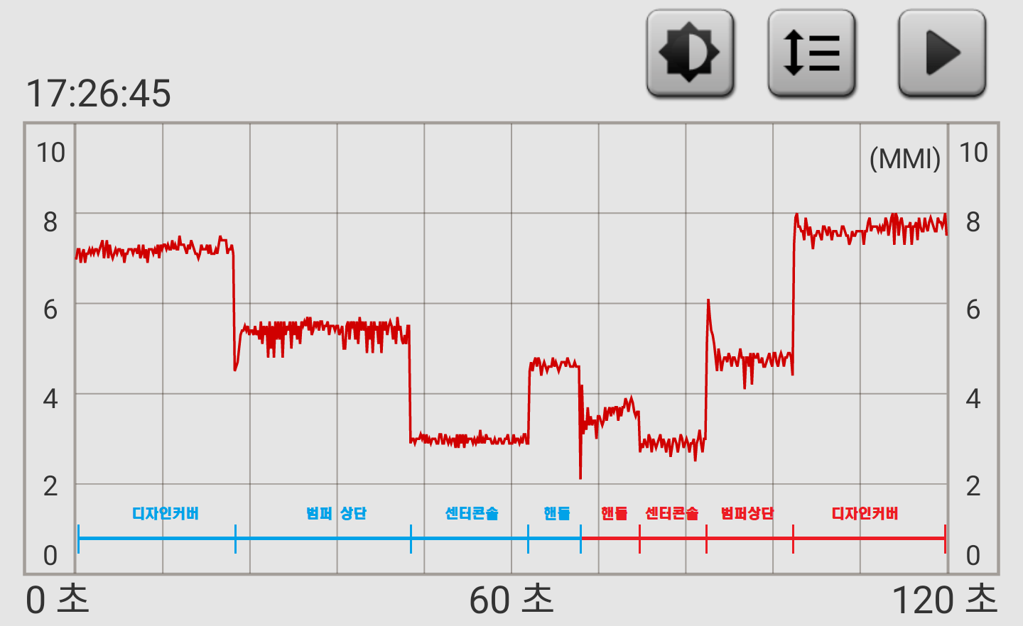 아래 이미지는 Smart Tools 앱의 진동 측정기 그래프이다. 시간축이 120초로 나타나지만, 연속하여 측정 한 것이 아니라 측정 위치와 측정 조건을 변경하기 전에 일시 중지 시킨 후, 위치를 옮겨 측정을 재개 하는 방식으로 기록하였다.