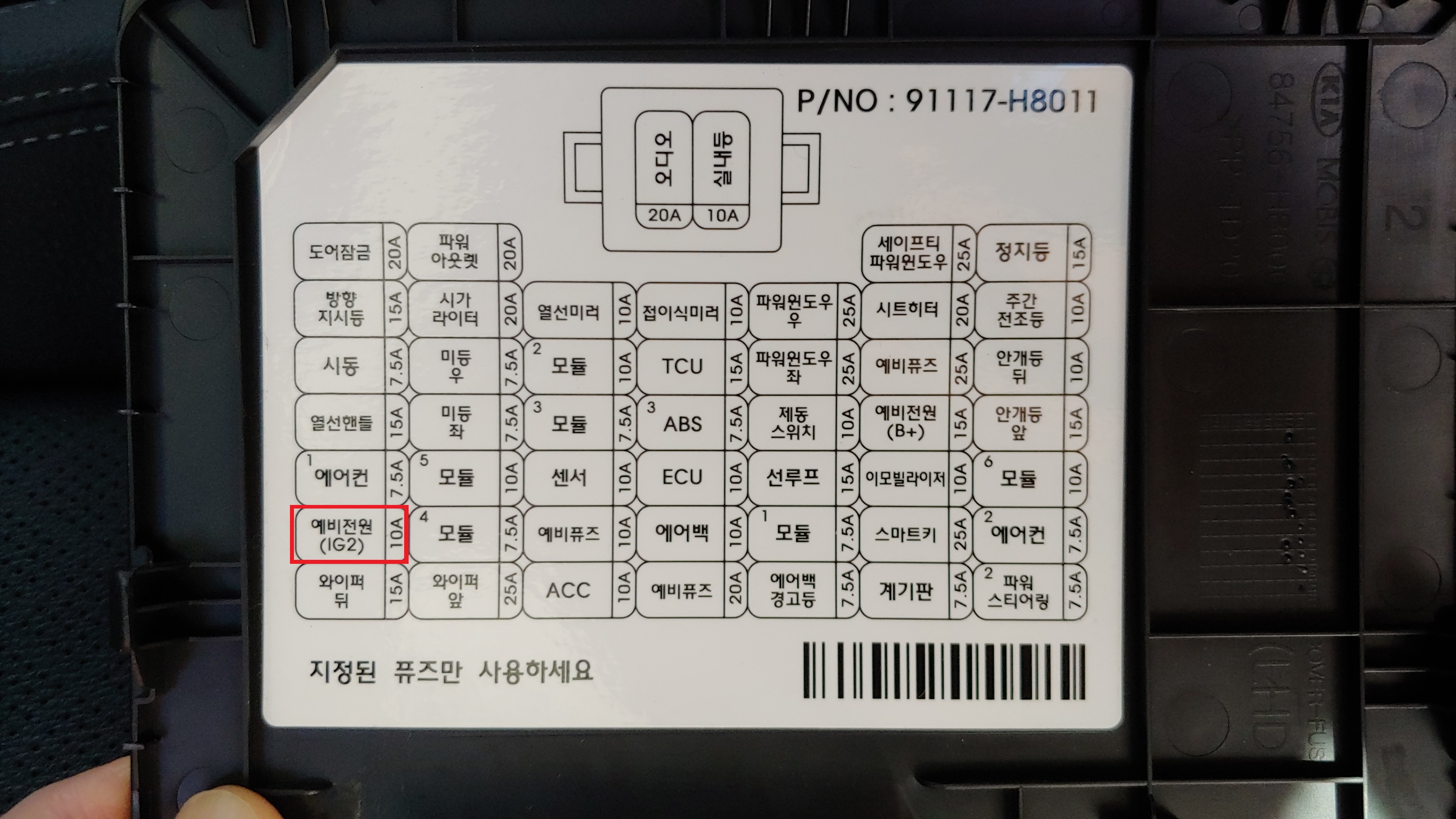 페달 블랙박스는 운행 중에만 동작하면 되기 때문에, 블랙박스의 전원은 퓨즈박스의 예비전원(IG2)1에 퓨즈 홀더를 이용하여 블랙박스의 ACC와 BAT+ 배선을 함께 묶어 연결하였다. IG2 퓨즈는 우측 사진의 가장 왼쪽이다.