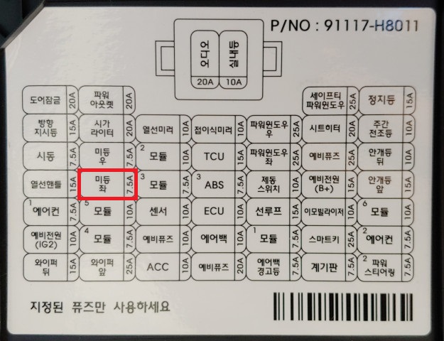 서두에 언급한 것과 같이 이번에 설치할 풋등은 페달 블랙박스의 조명용이기 때문에 미등과 연동하여 사용해야 한다. 퓨즈박스에서 미등(좌) 퓨즈에 연결하는 것으로 결정했고, 퓨즈의 입/출력 위치를 확인한 후 배선을 출력측인 좌측에 연결했다.