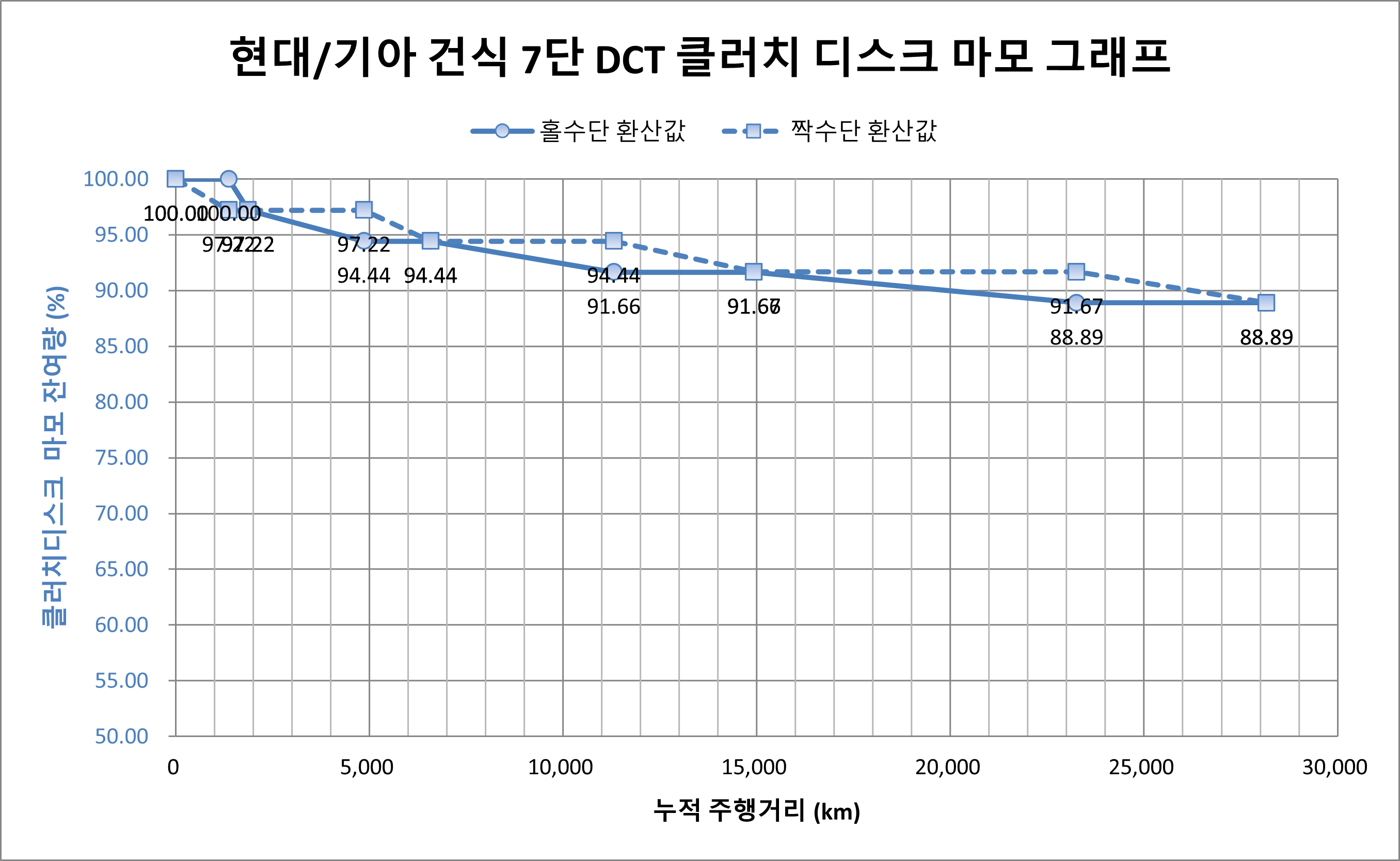 필자의 차량인 스토닉은 2차에 걸친 DCT교환 작업에도 불구하고 클러치 마모 잔여율이 100%로 초기화 되지 않고 이전의 마모잔여율을 그대로 이어가고 있다. 이에 OBD2 스캐너를 통한 이 값은 보정치가 반영되지 않은 Raw 값으로 판단하고 현재 값을 100%로 간주1하여 새롭게 기록을 시작한다.
