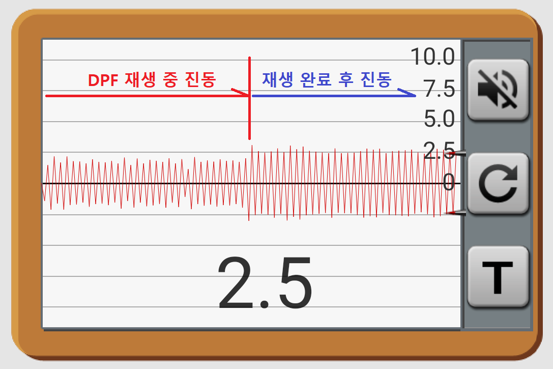 아래 이미지는 DPF 재생 도중 과 재생 완료 후 진동을 비교한 수치이다. 재생 도중에는 약 2 전후의 수치(진도)를 나타내었으나, 재생이 완료된 후 약 2.5 전후의 수치를 보이고 있다. 해당 수치는 LG G7 스마트폰에서 스마트툴즈앱의 진동측정 모드를 이용하여 스티어링휠(핸들) 스포크와 컬럼 슈라우드 사이에 스마트폰을 올려두고 측정한 것이다.