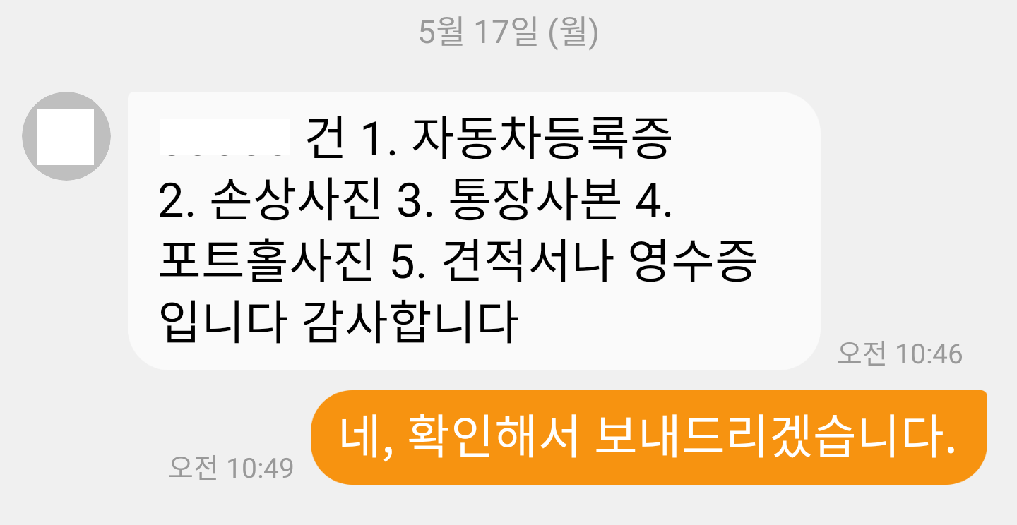 보험사 보상 담당직원과 최초 통화한 지 한달여가 지났지만, 연락이 오지 않았고, 지자체 보상 부서에 다시 연락했다. 몇 분 후 보험사에서 연락이 왔고 필요한 서류를 문자메시지로 보내주었다.