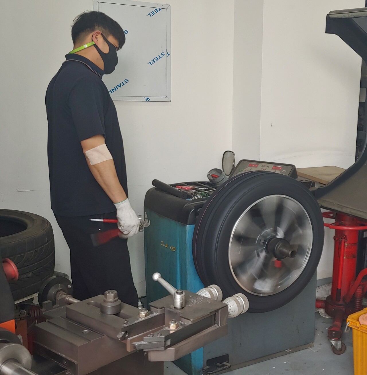 손상부위를 다시 촬영해 두고 교환작업을 실시한다. 새 타이어를 뒤에 장착할까 잠깐 고민하다가 뒤타이어의 마모가 눈에 띄지 않았고, 위치교환 없이 추후 앞타이어 교환 시점에 4바퀴의 타이어를 함께 교환할 예정이므로 그대로 앞 휠에 장착한다.