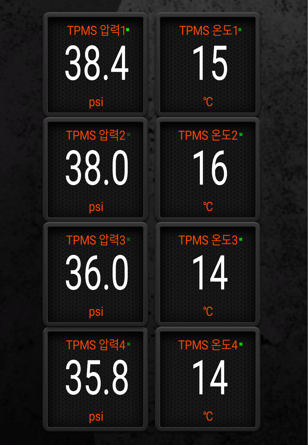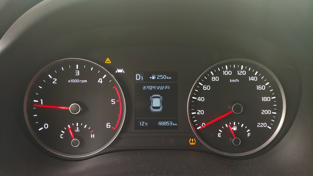 타이어 교환 후 시동을 걸면 TPMS가 초기화 되어 공기압 부족 경고가 표시된다. 수백미터 주행 후 정상으로 돌아왔다.