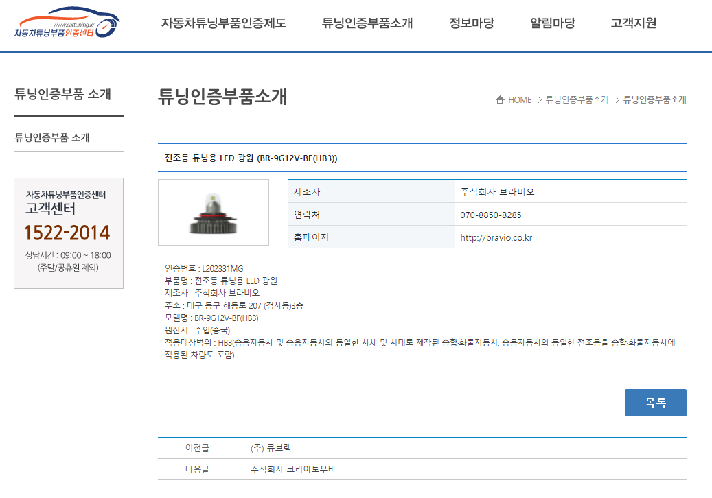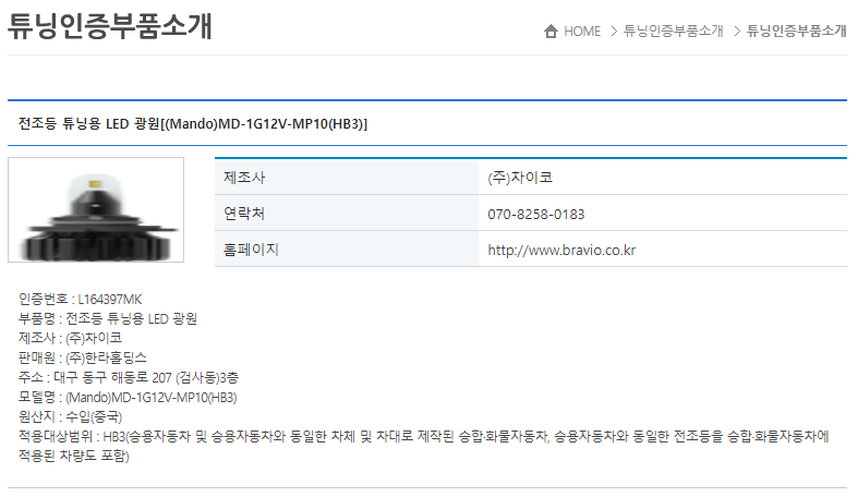 자동차 튜닝부품 인증센터에 HB3 규격의 바이펑션 헤드램프용 인증제품이 추가 등록되었다.