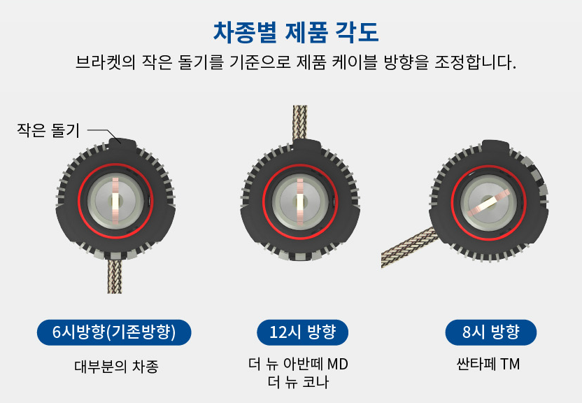 제품의 케이블 각도는 주문시 입력한 차종에 맞추어 발송된다. 새제품을 받은 경우 케이블의 위치를 조정해 줄 필요는 없으나, 차종이 변경되는 경우 별도로 조정을 해 주어야 한다.