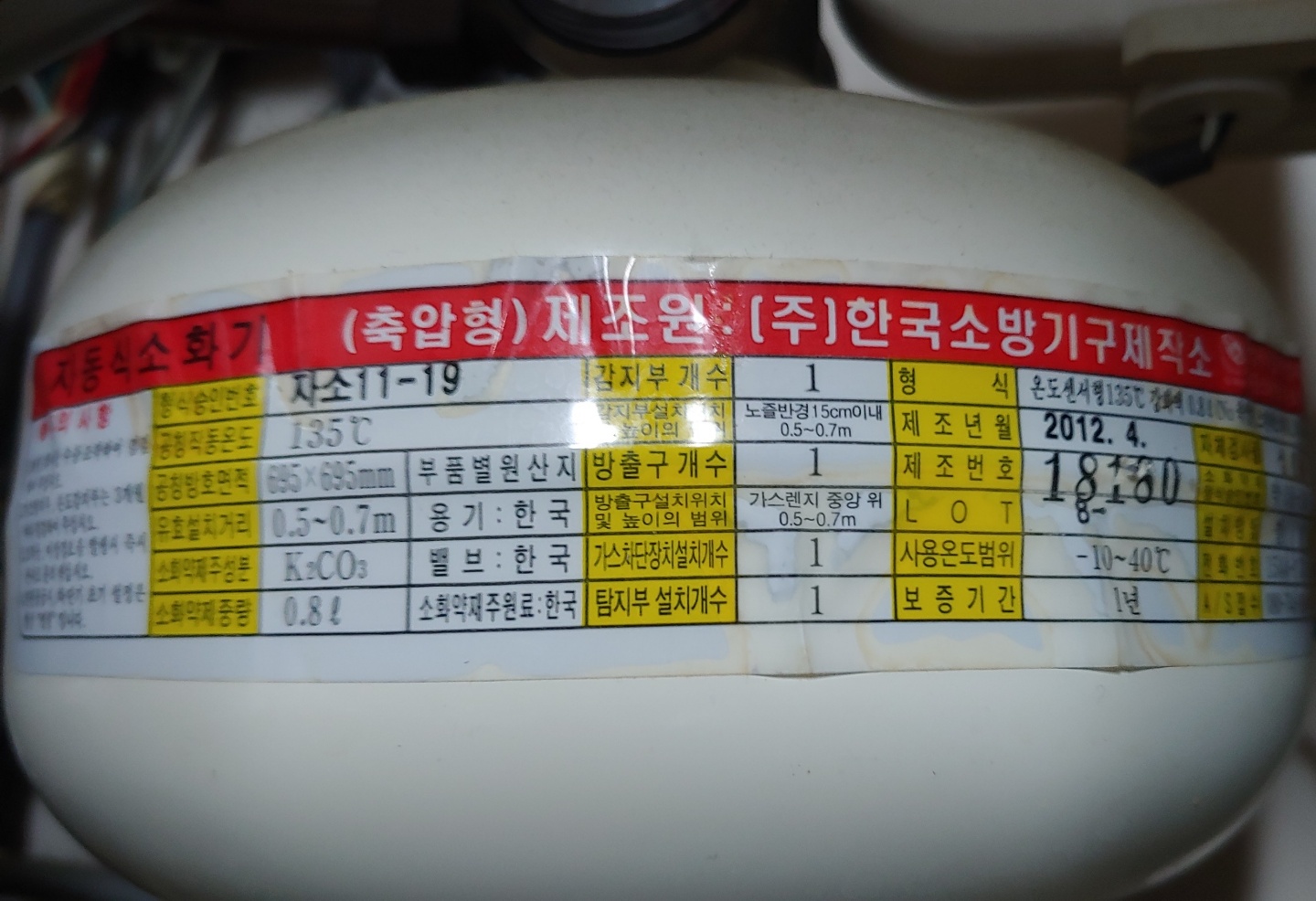 압력경고가 발생한 원인은 씽크대 상단에 수납된 소화기의 압력이 정상범위 미만으로 낮아진 것으로 추정된다. 필자는 2010년 4월에 입주하여 현재 입주 12년차인데, 제조년월이 2012년 4월로 기록되어 있다. 교환한 기억은 없지만, 입주 3년차에 한번 교환 받았던 것 같다.