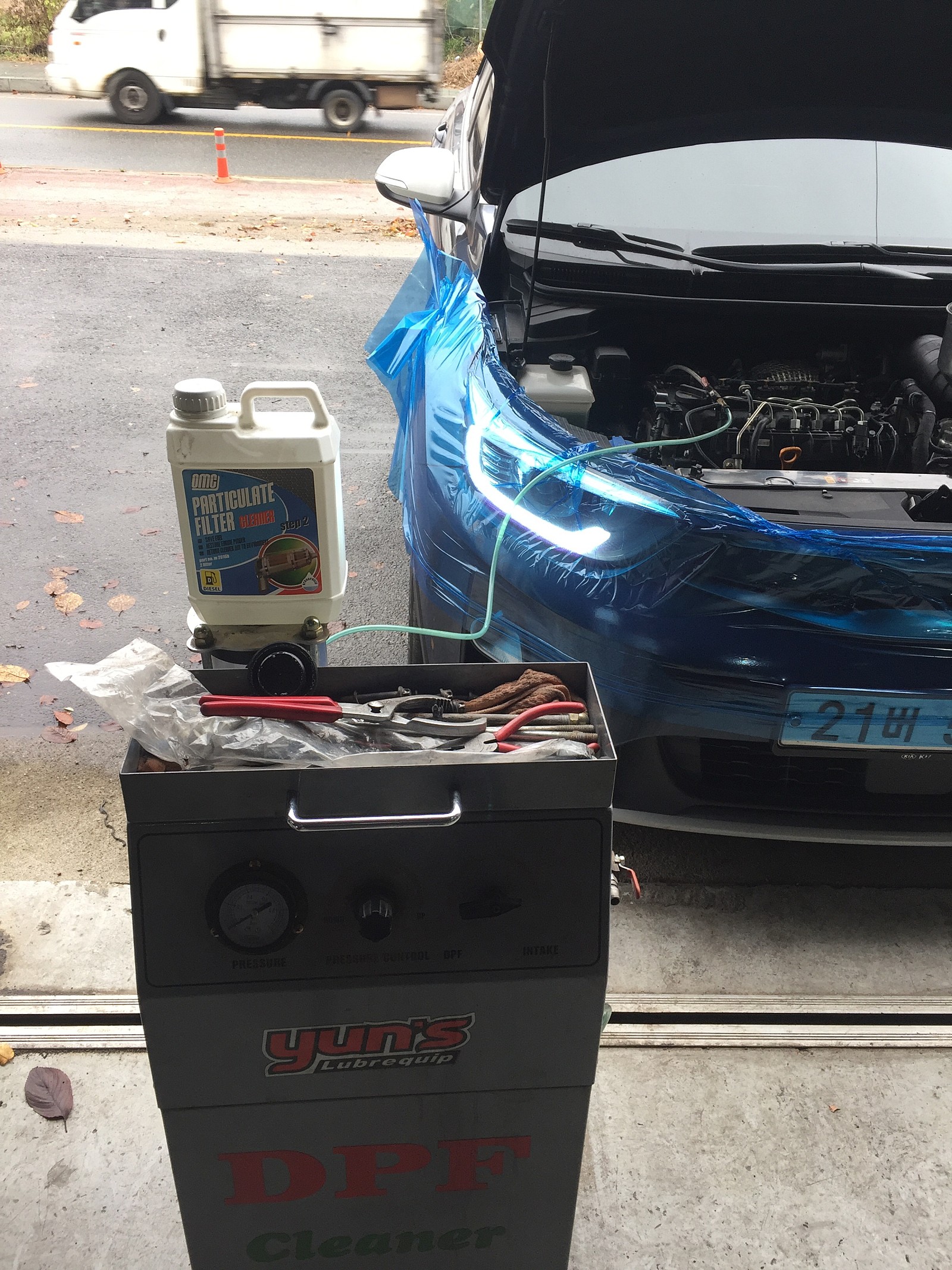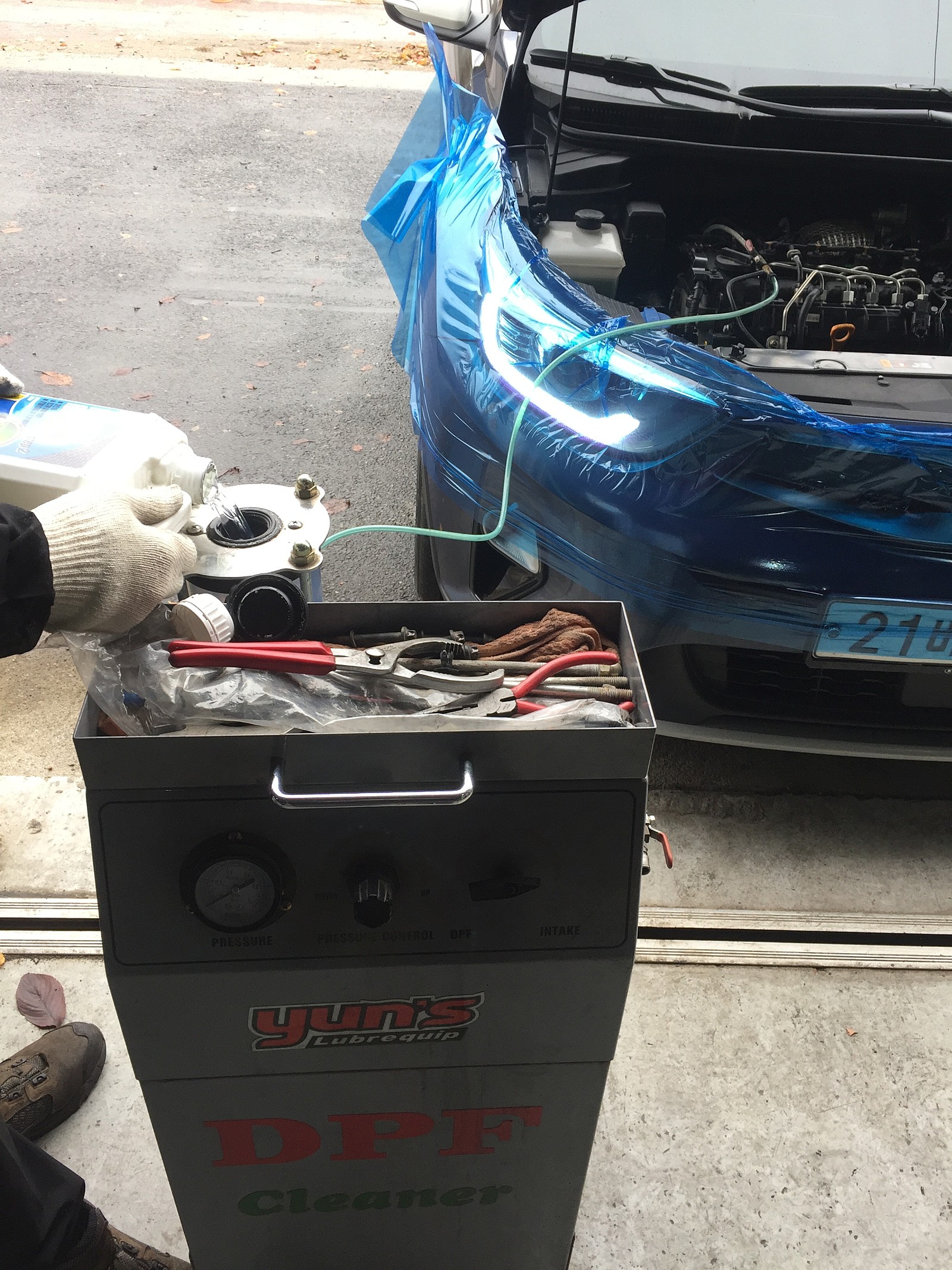 DPF는 약품을 주입하여 불린 후 불어내는 방식으로 진행했다. 탈거식에 비해 효과는 적지만, 보증기간이 남은 관계로 탈거하지 않고 진행했다.
