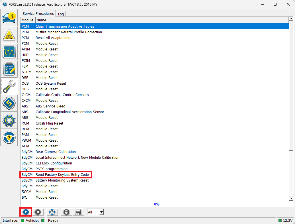 Service functions 로 진입하고 BdyCM (Body Control Module)의 Read Factory Keyless Entry Code를 실행하고, Ok 버튼을 클릭한다.