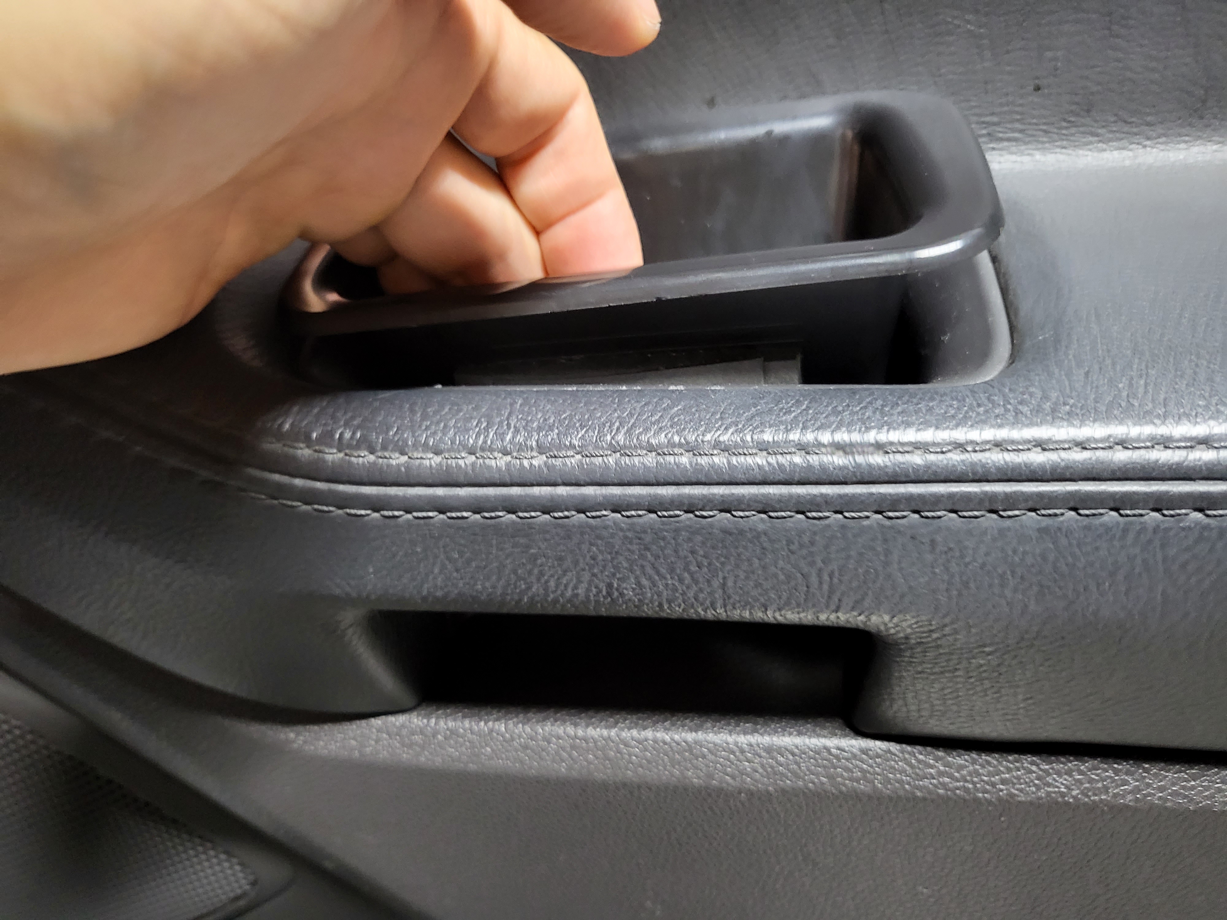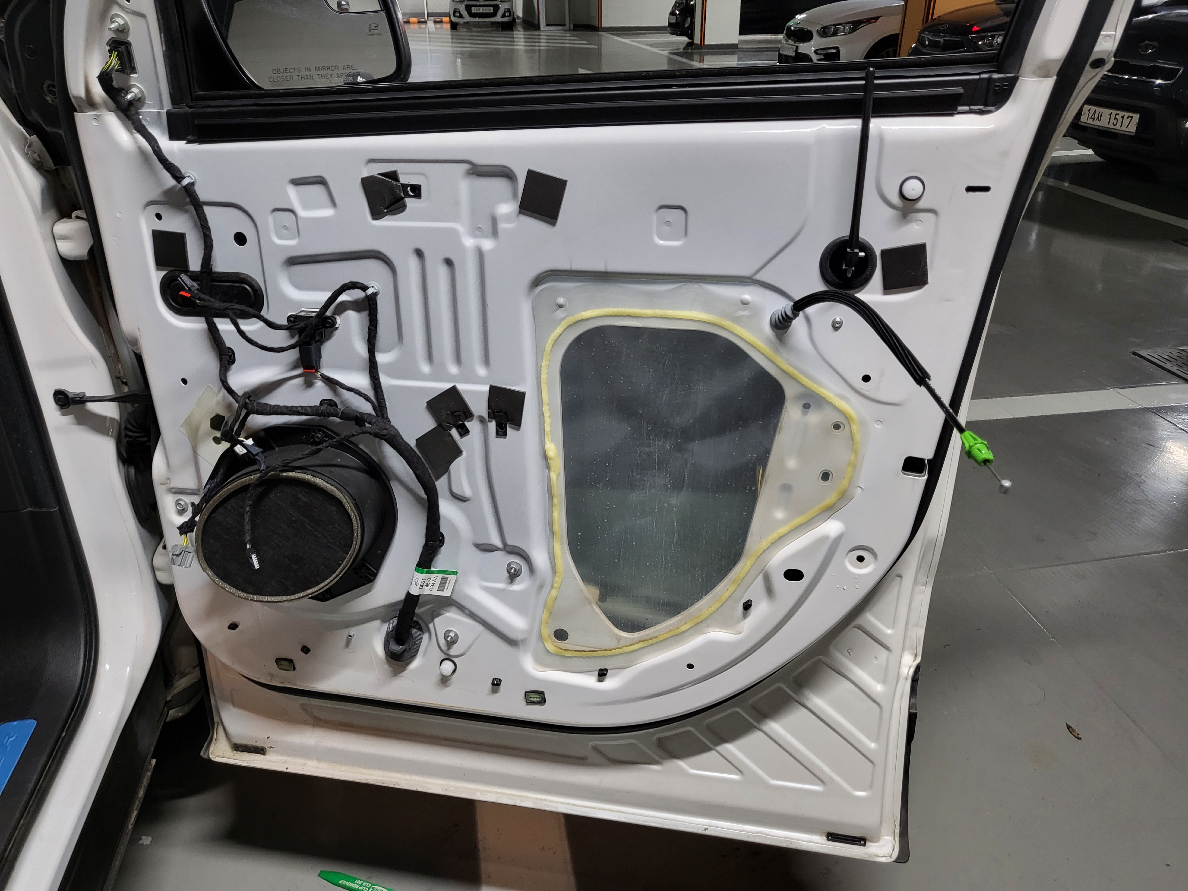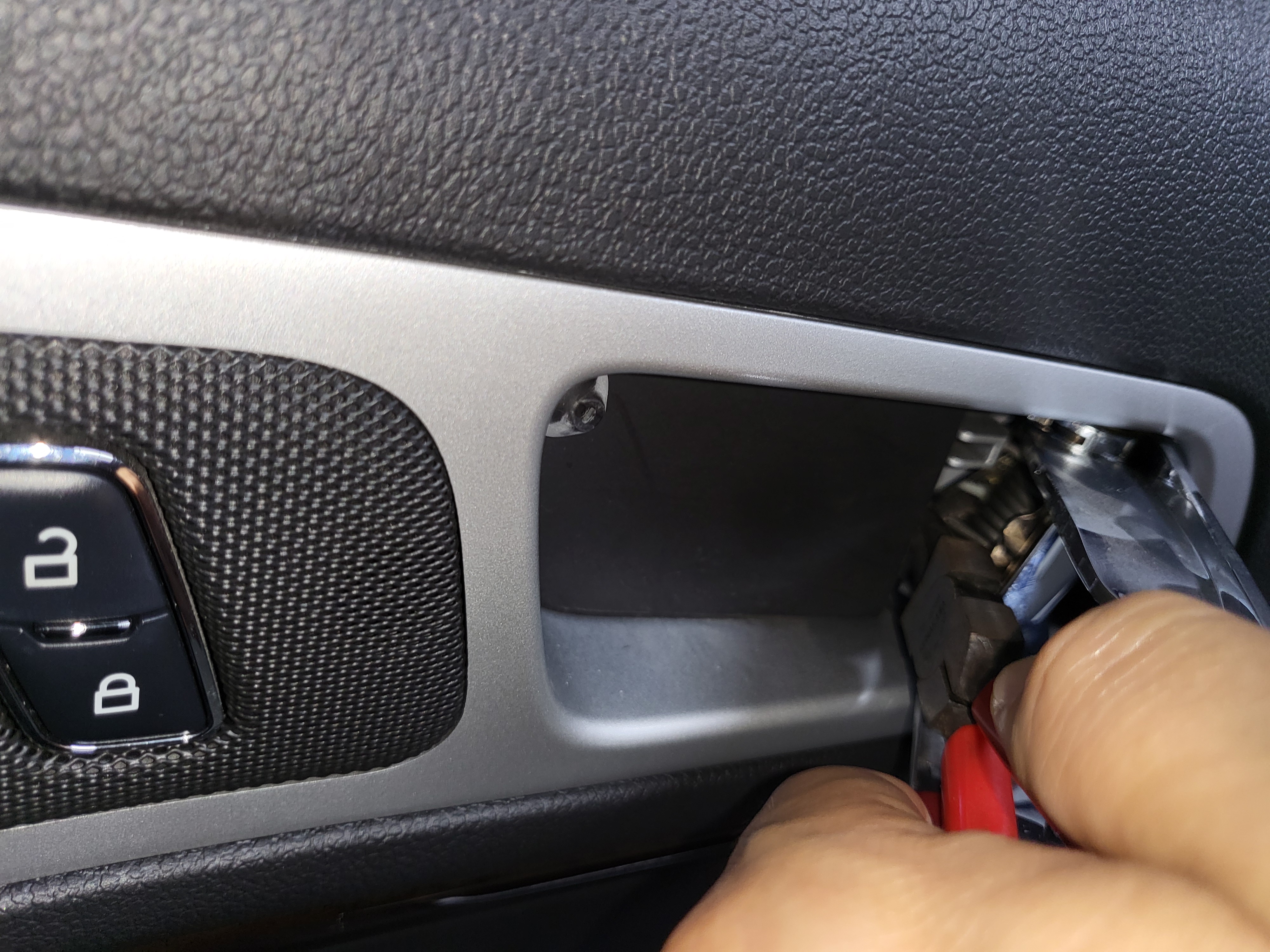 완전히 탈거하기 전에 트림 안쪽의 각종 커넥터를 제거한다. 전장 커넥터는 잠금장치를 눌러서 탈거하고, 도어캐치 케이블은 스냅링 플라이어(롱노우즈 플라이어 사용 가능)를 이용하여 플라스틱 부분을 눌러서 잡아당긴 후, 케이블은 금속브라켓에 난 홈을 통과시켜 탈거할 수 있다.