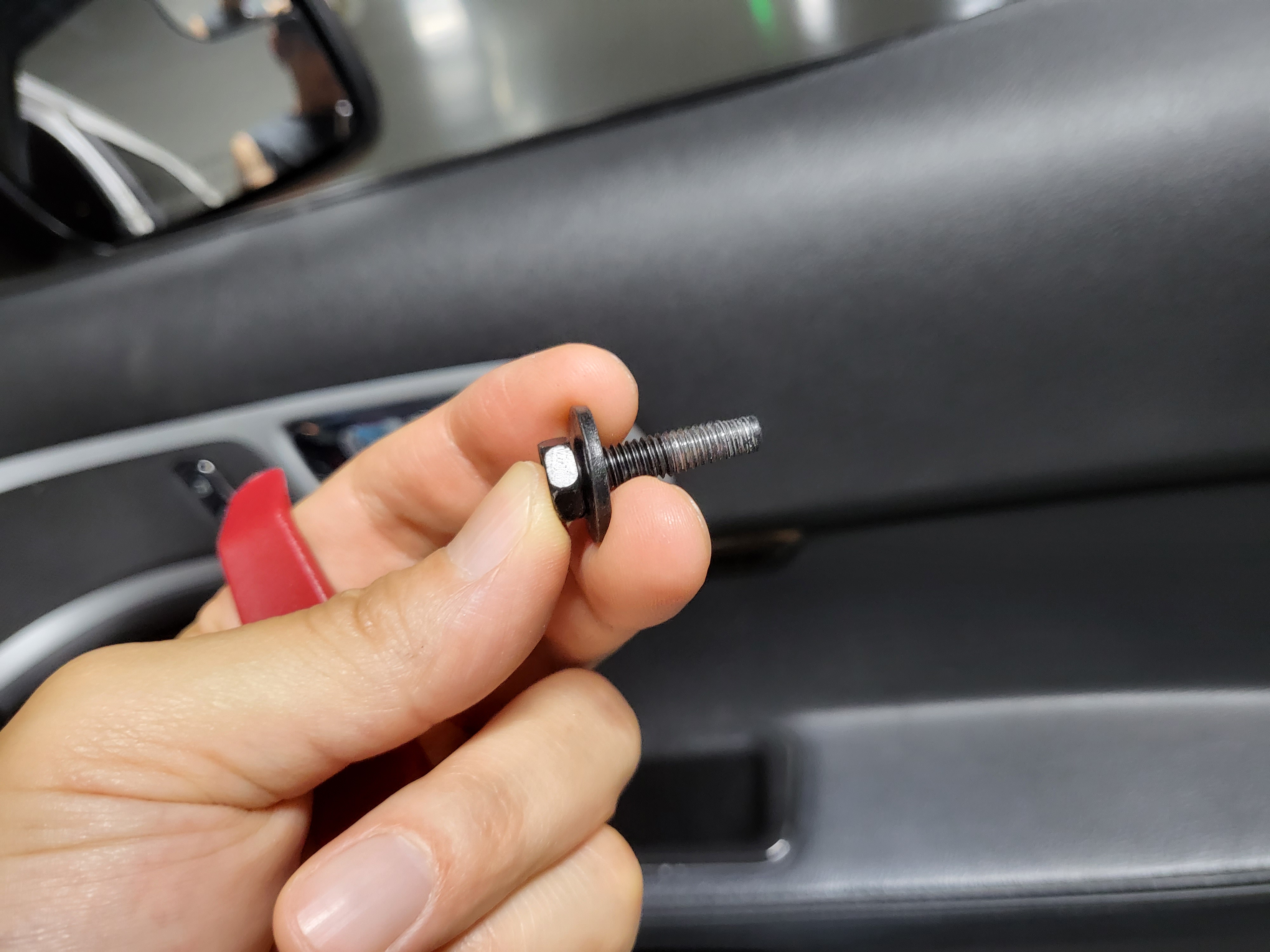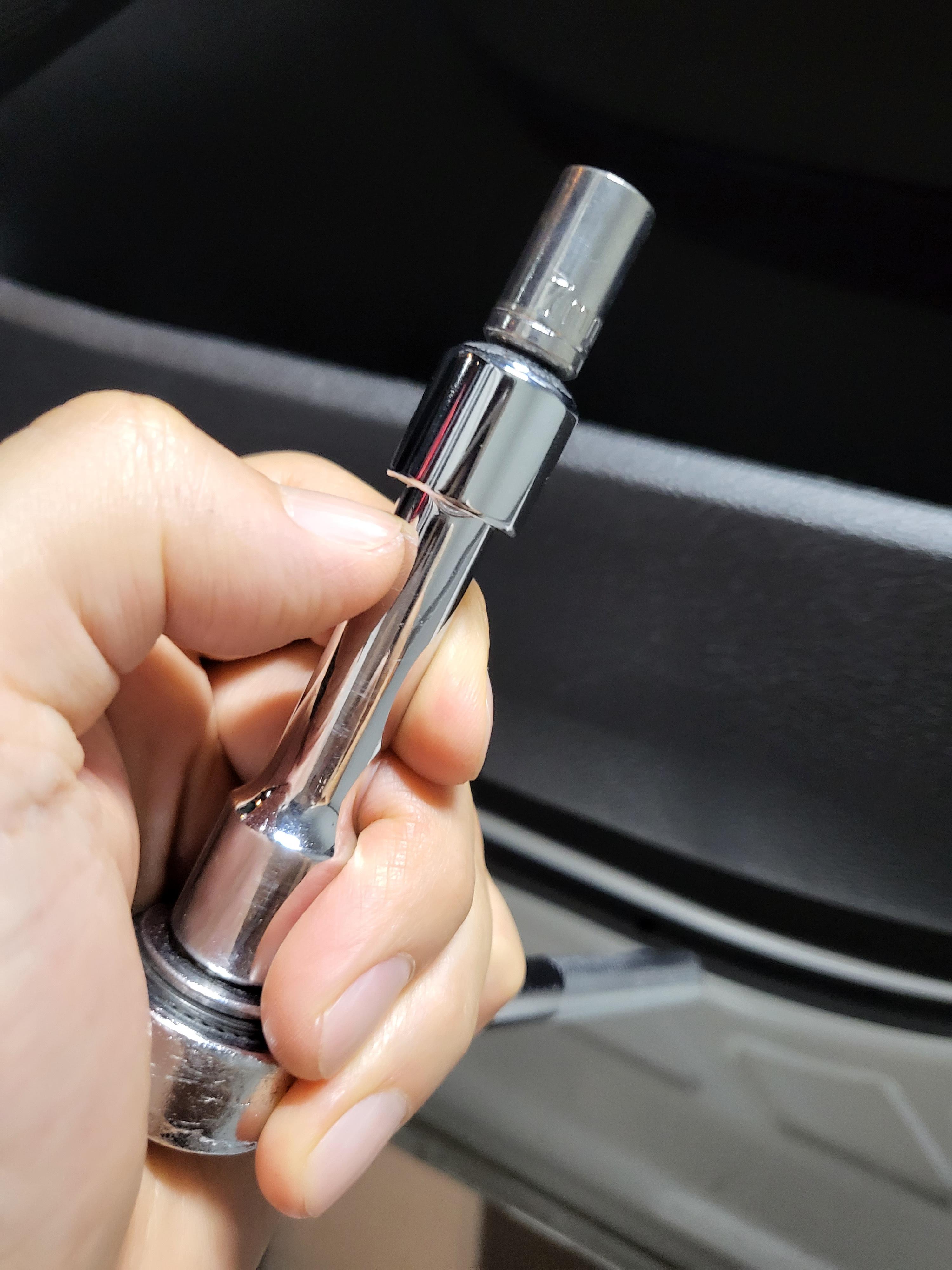도어 손잡이의 수납함을 제거하고 내장재 리무버를 이용하여 커버를 탈거한 후, 내부 볼트는 10mm 소켓과 연장대(기존연장대는 짧아서 큰 라쳇핸들과 연장대 사용)를 사용하여 탈거한다.