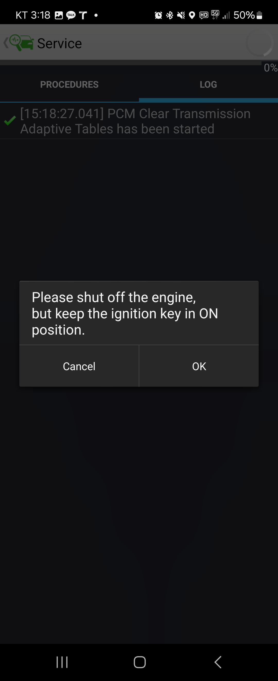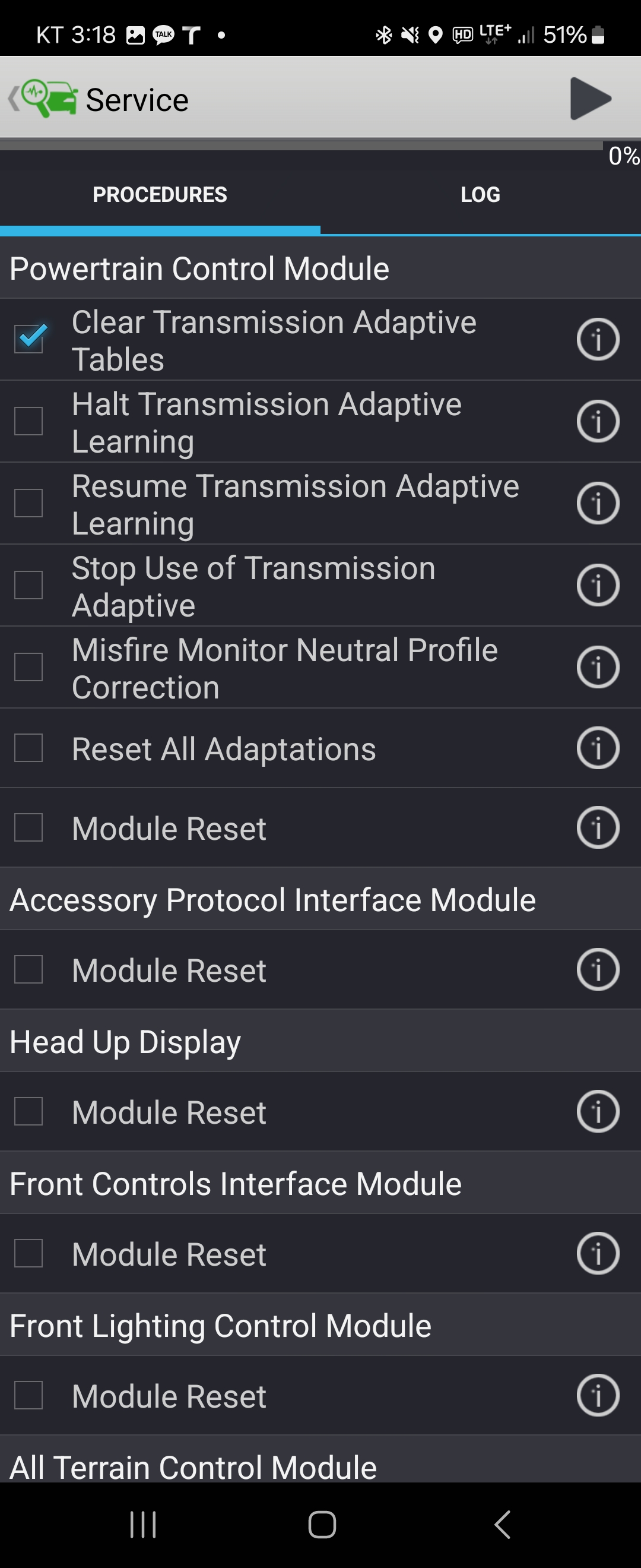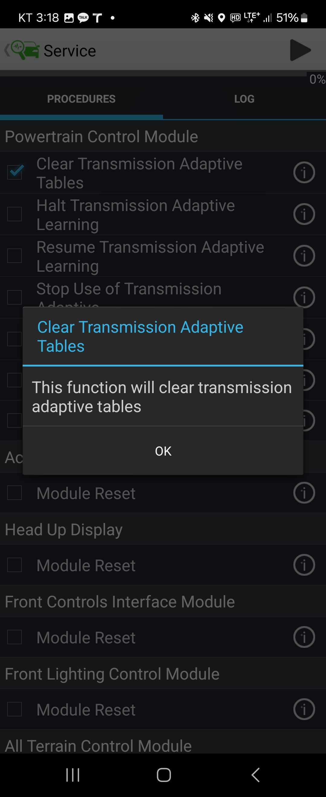 Powertrain Control Module (PCM) 그룹의 "Clear Transmission Adaptive Tables" 를 선택하고 시작(Play) 버튼을 터치한다. 몇가지 안내와 주의사항이 표시되므로 내용을 잘 읽어보도록 한다.