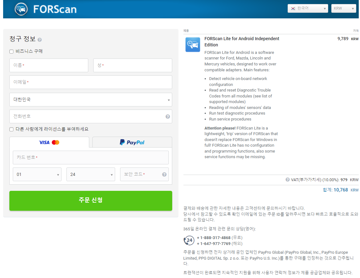 FORScan Lite for Android는 링크를 통해 현재 환율기준 10,768원에 구매할 수 있다. 신용카드(비자/마스터) 또는 페이팔로 결제가 가능하다.