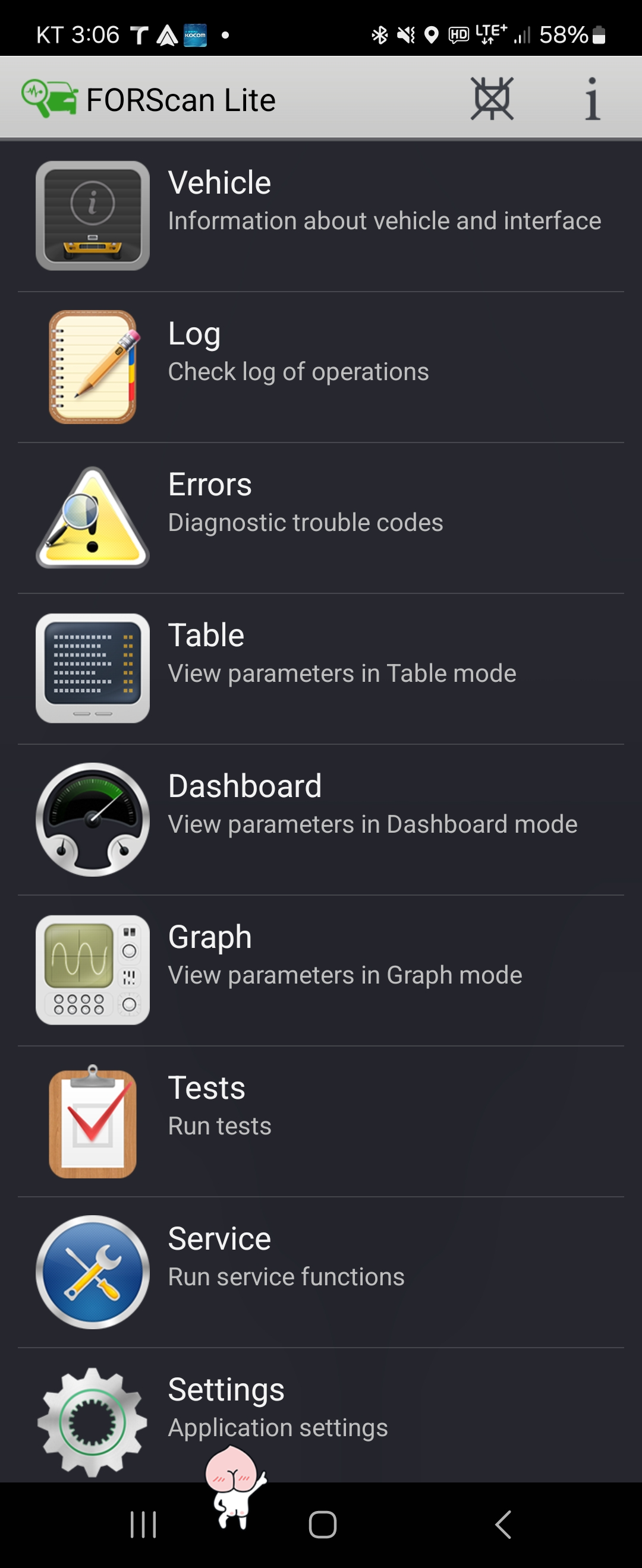 FORScan Lite for Android 실행 화면이다. 차량의 시동(또는 ON)을 걸고 Setting -> Bluetooth Adapter 메뉴에서 사용할 OBD 스캐너를 선택한 후, 메인화면에서 연결 버튼을 터치하면 차량과 연결된다.