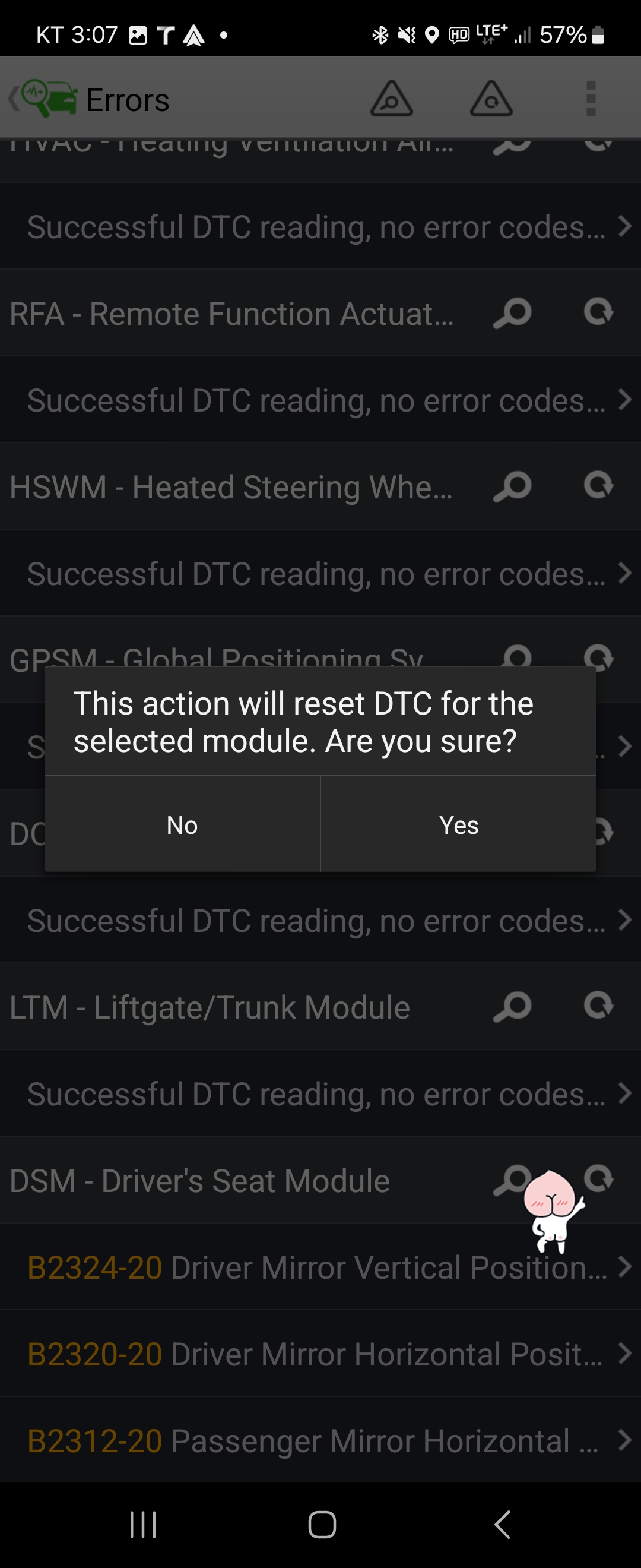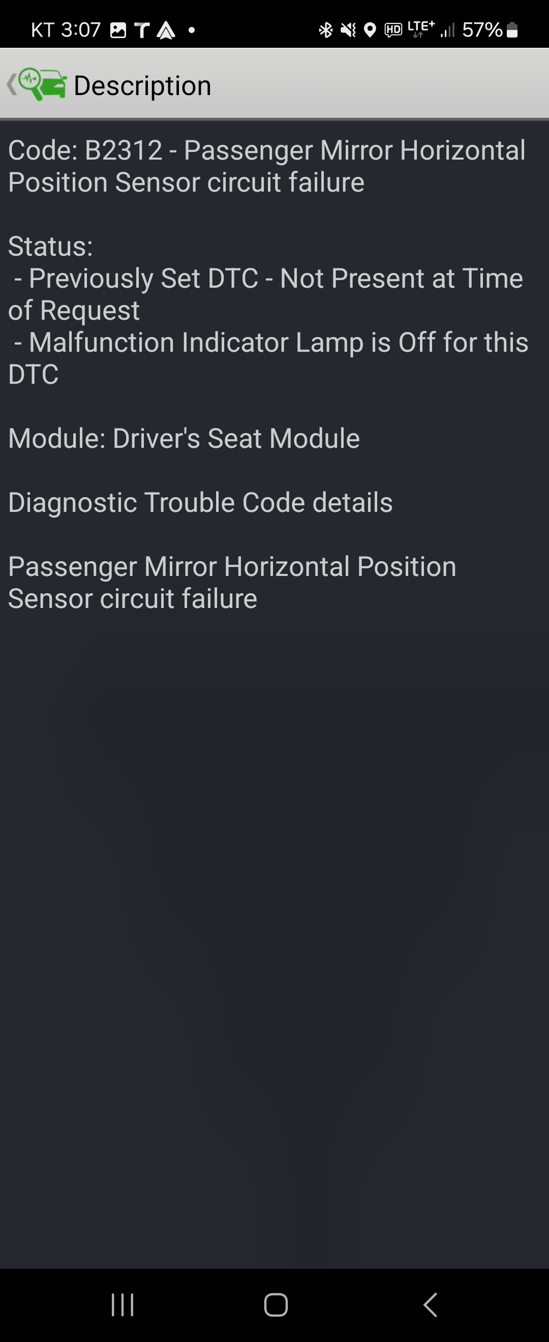 발견된 고장코드는 DSM(Driver's Seat Module)의 운전석측 사이드미러의 수직/수평 위치센서, 동반석측 사이드미러의 수평 위치센서의 결함을 나타내고 있으며, 현재가 아닌 이전의 고장으로 소거해도 관계없는 고장코드이다.