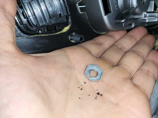 13mm 소켓과 연장대로 내캐치 어셈블리 고정 너트를 풀어낸다. 너트는 철판을 가공하여 만든 것이고, 나사산이 플라스틱 사출물이라서 탈거 중 살짝 마모되지만 재장착에는 문제 없었다.