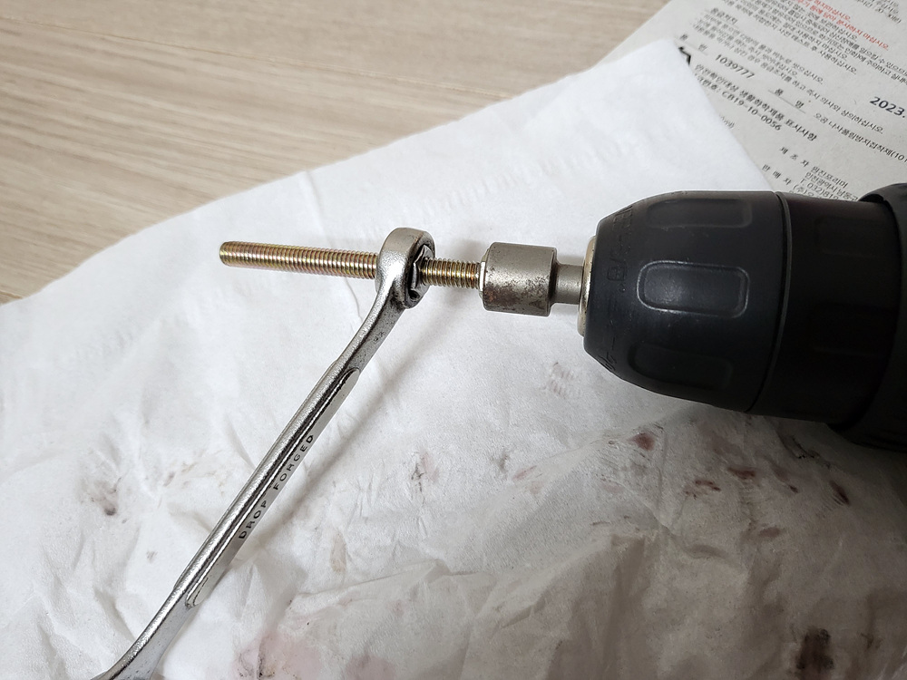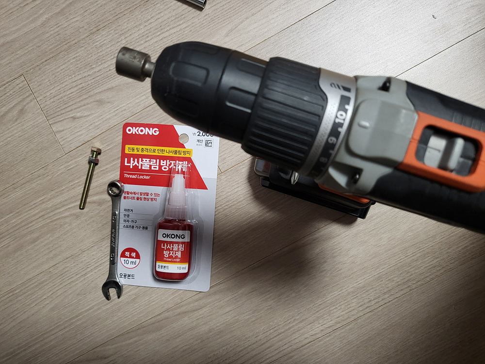 10mm 볼트에 제품을 도포하고 너트를 전동드릴의 최대 토크로 조여준 후 충분히 경화될 수 있도록 2시간 정도(설명서상에는 20-30분) 기다린 다음 스패너를 이용하여 풀어봤으며, 큰 힘은 들지 않았다.