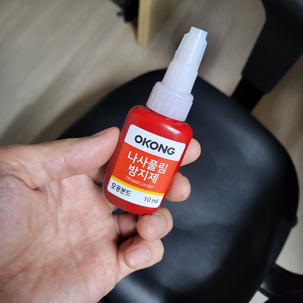 손으로 최대한 조여도 어느새 흔들리고 있는 팔걸이를 오공사의 나사풀림 방지제로 고정해 보았다.