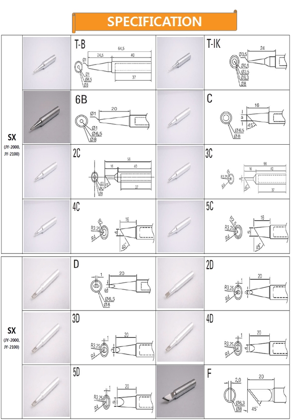 쇼핑몰을 통해 JY-2000, 2100용 인두팁을 찾아본다. 기존것보다 좀더 가느다란 일반팁과 칼팁을 구매하고자 규격을 확인했다. 제품 규격표에 표시된 대로 SX-T-IK 및 SX-F를 구매하려고 확인했지만, 목록의 옵션과 정확하게 일치하지 않는다.