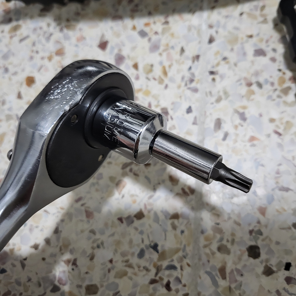 라쳇렌치, 육각 변환 어댑터, T30 Torx 렌치와 체인링 너트 렌치를 이용하여 세장의 체인링을 모두 탈거한 후 세척해둔다.
