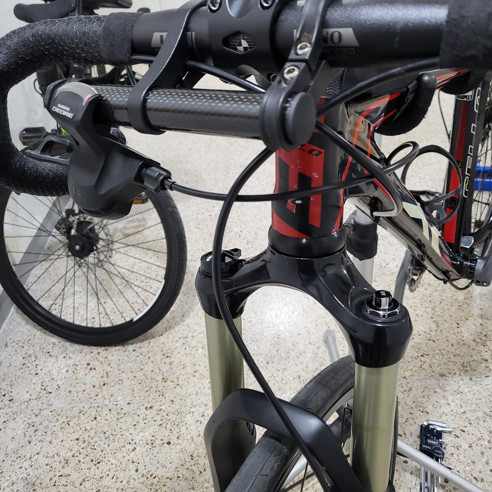 변속레버는 핸들바 익스텐더에 물리기로 했다. 핸들바 익스텐더는 원래 싱글암이지만 다른 익스텐더에서 클램프를 추출하여 더블암으로 구성했다2. 이 세팅으로 후드를 잡으면 변속이 불가능하지만, 탑을 잡은 상태에서는 검지를 사용하여 고속으로 변속이 가능하고, 바텀을 잡은 상태에서는 엄지를 사용하여 고속 및 저속 변속이 모두 가능하다.