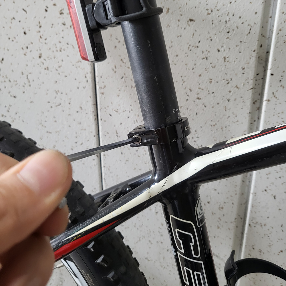 시트포스트를 삽입하고 클램프 볼트를 조인다. 육각렌치로 저항이 느껴질 때까지 조인 다음, 토크렌치로 마무리한다. 클램프에 표기된 적정토크는 5 N·m이다.