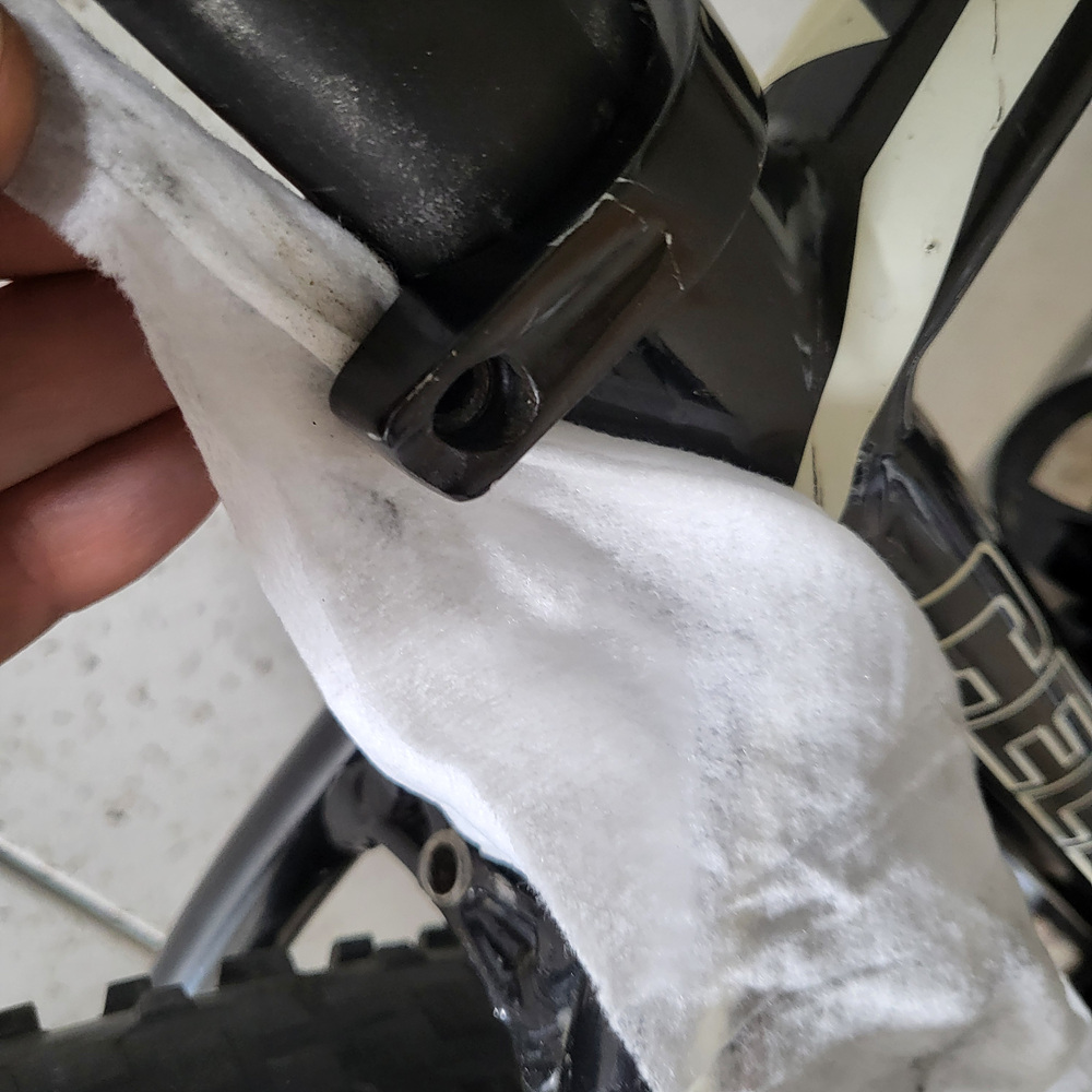 두번째로 시트포스트를 물티슈로 닦은 다음 물기를 제거하고 그리스를 얇게 도포한다. 그리스 도포는 생략해도 관계없으며, 이때 시트포스트가 내려갈 것이 우려된다면 클램프 설치 부위 아래 쪽만 도포해도 된다.