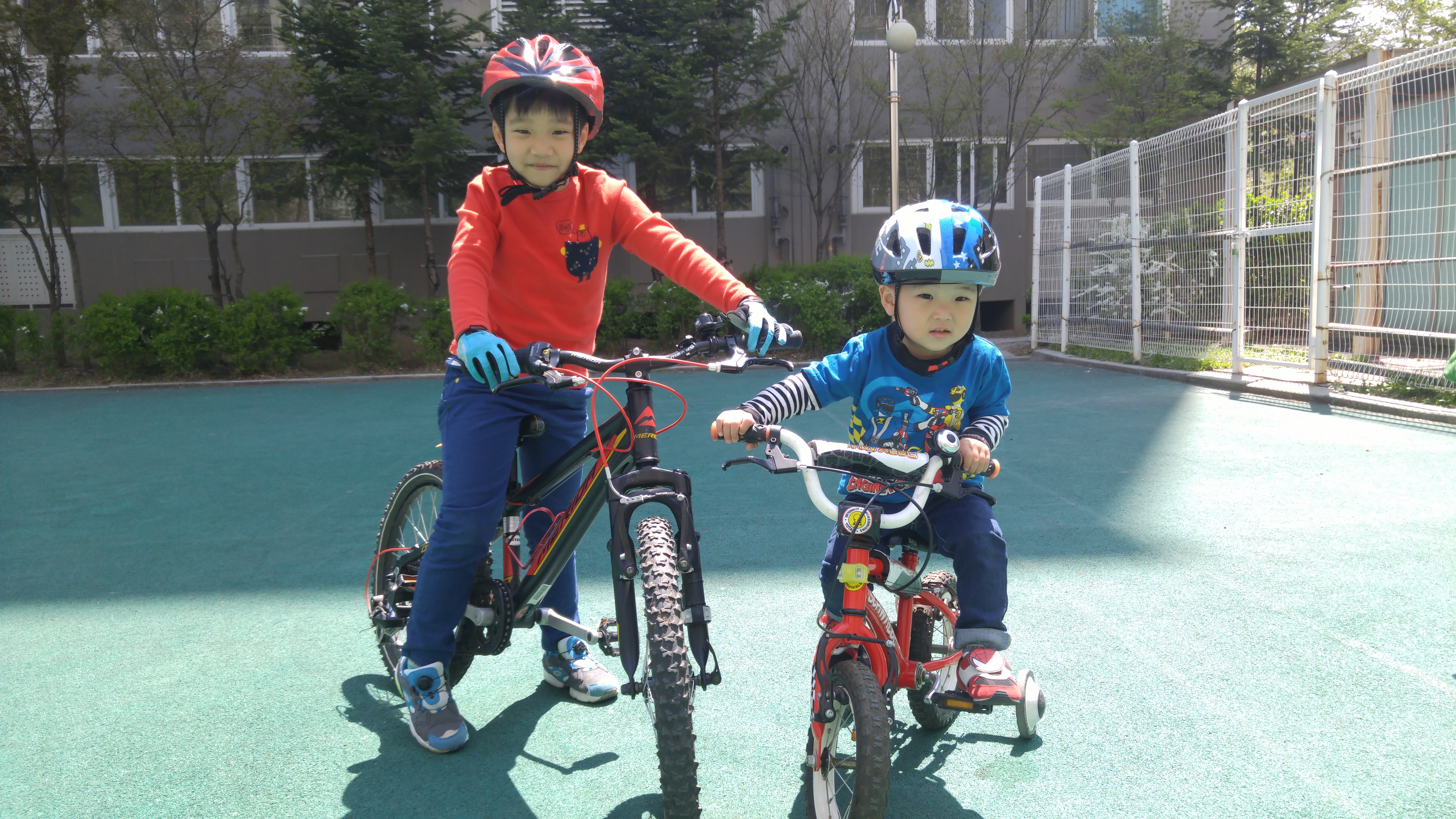 간단히 핸들바를 좀 낮추고, 싯포스트도 조금 내려주었다. 변속 방법을 간단히 설명하고, 4살짜리 작은녀석과 함께 테스트 라이딩 ㅎㅎ
