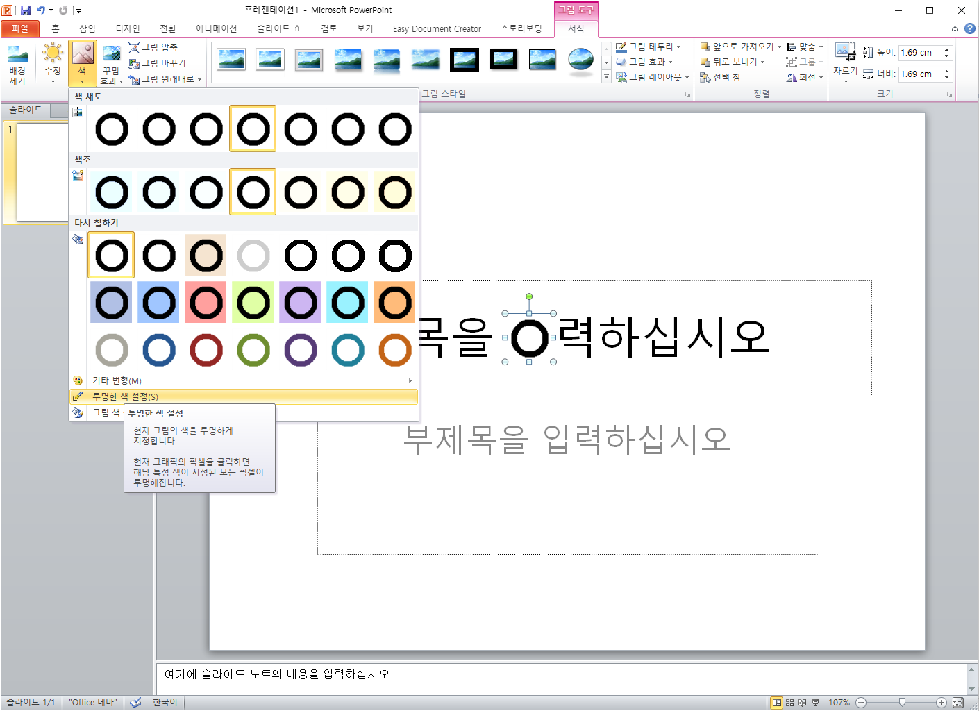 3) 서식 -> 색 -> "투명한 색 설정" 메뉴를 클릭하고, 투명하게 처리할 이미지를 클릭한다.